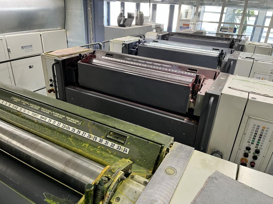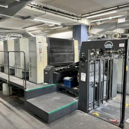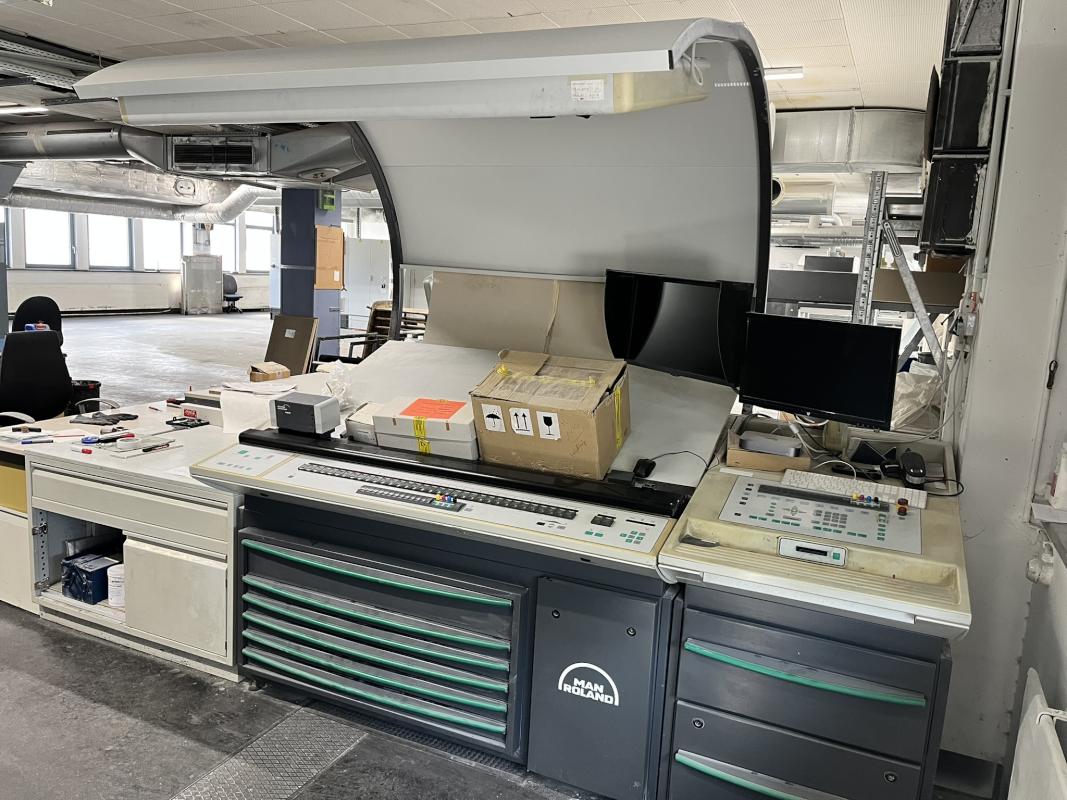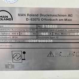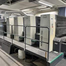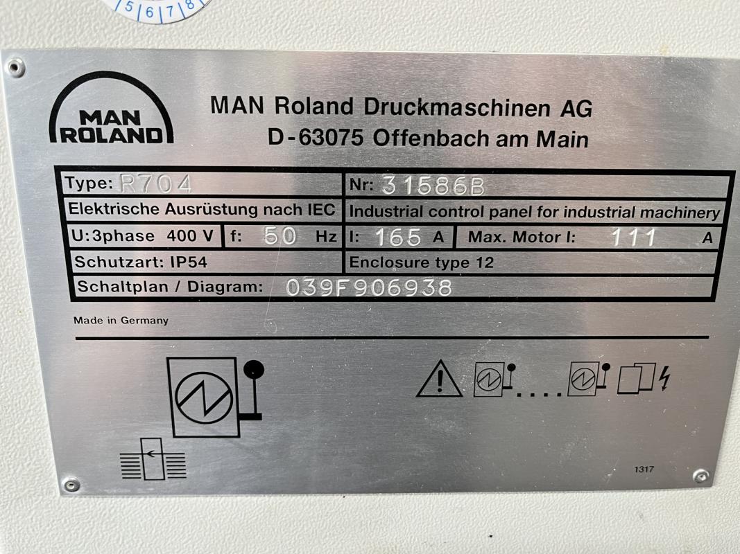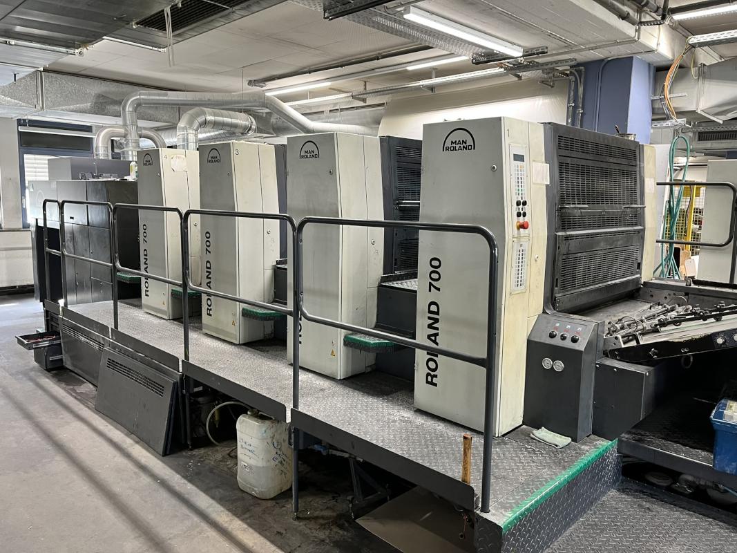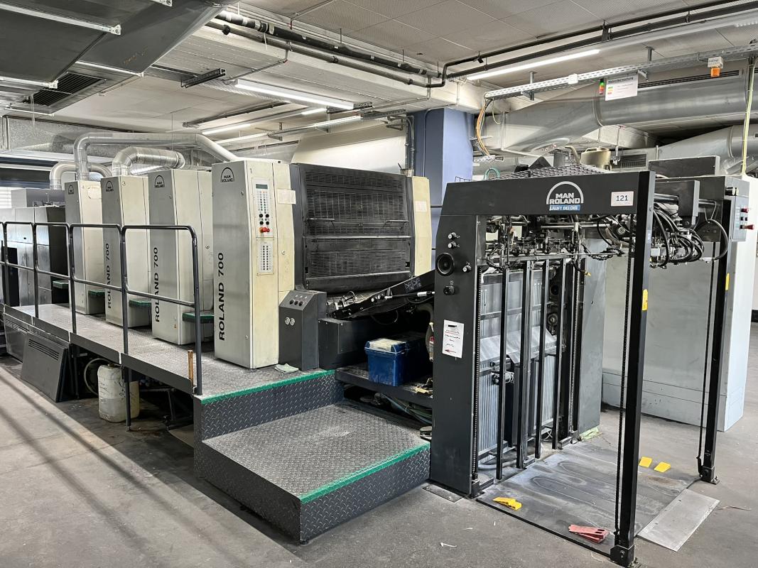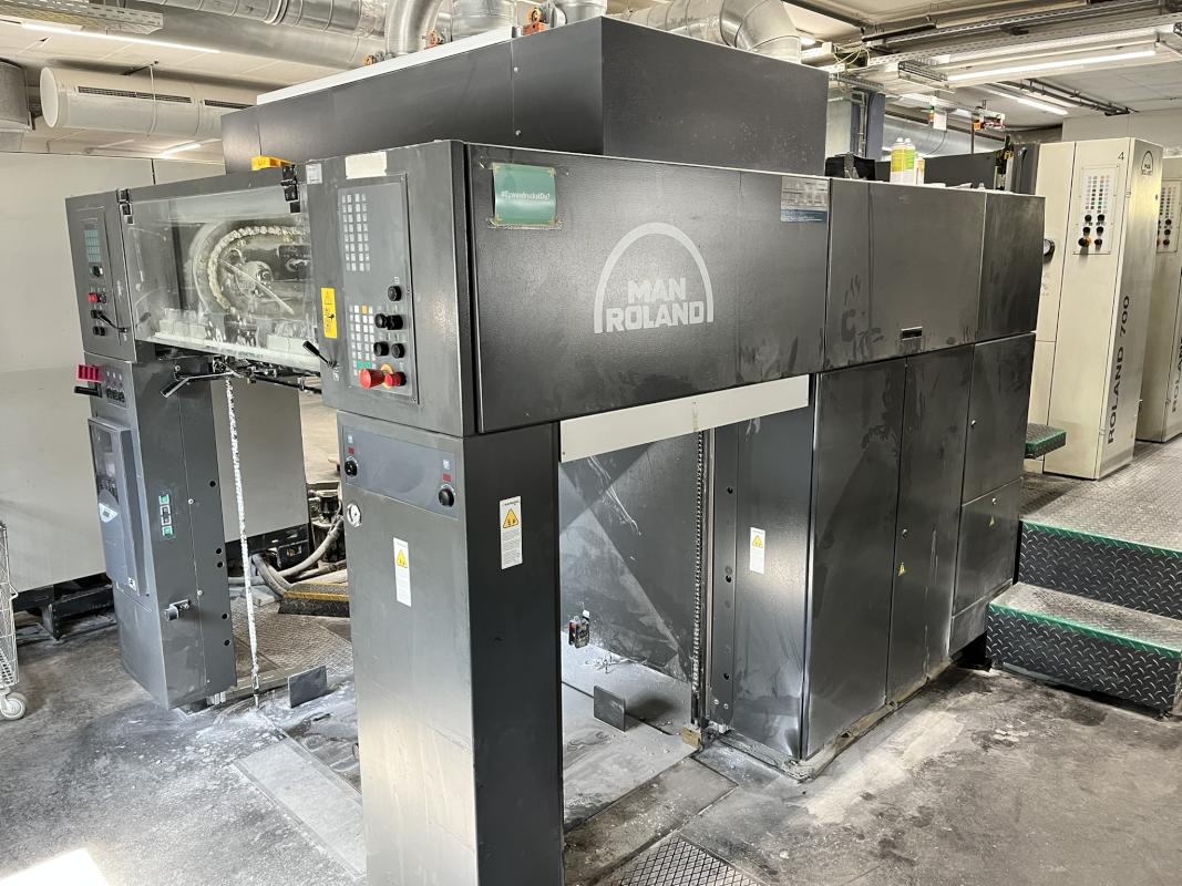 Make: MAN ROLAND, Model: R704 3B, Year of construction: 2005, Serial no. 31586B, sheet format max. 740x1,040 mm, sheet format min. 340x480 mm, printing area max. 715x1,020 mm, printing plate format 785x1,030 mm, machine speed for perfecting max. 17,000 sheets/h, consisting of: sheet feeder, electromechanical double sheet control, 4 printing units, automatic blanket washing device, automatic plate change with motorized clamping and tensioning APL, automatic ink roller washing device, Roland Deltamatic film dampening unit, Roland AirGlide high-stack delivery, PECOM Press Center control station with JobCard Reader, special accessories: QuickChange job change, QuickChange Air air control, QuickChange Color universal inking unit, reduced IPA, Weko AP 262 powdering device with extraction, Roland Secomatic IR dryer, ColorPilot color measurement and control system, number of prints 446 million - as of 04/25