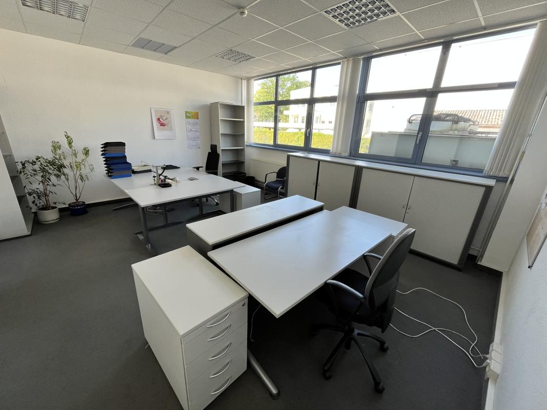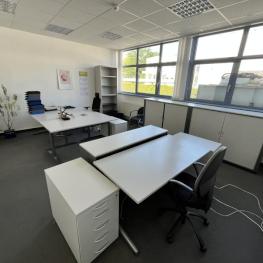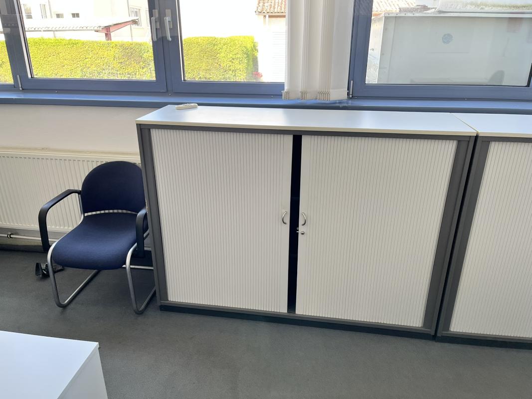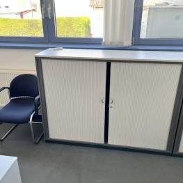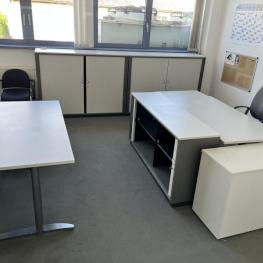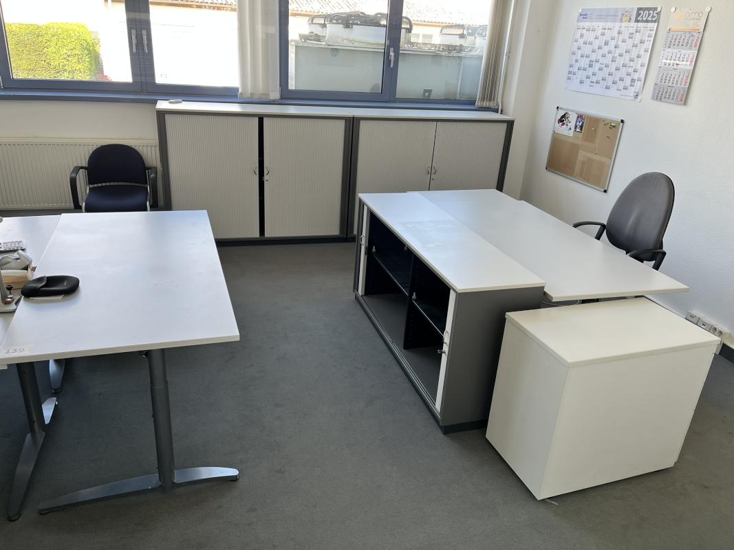 Consisting of: 4 desks, 4 floor-standing containers, each with 4 pull-out drawers, 2 office swivel chairs, fabric cover, visitor chair, 2 file shelves, W 1,000 mm each, 3 cross-roller shutter cabinets