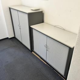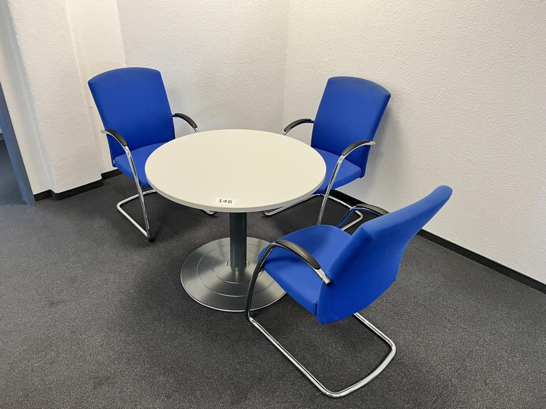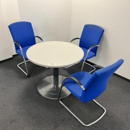 Consisting of: meeting table, round, heavy, center base, 3 cantilever chairs, fabric cover, blue, brochure stand, 4 slanted displays, rolling cart, 4 cross-roller shutter cabinets