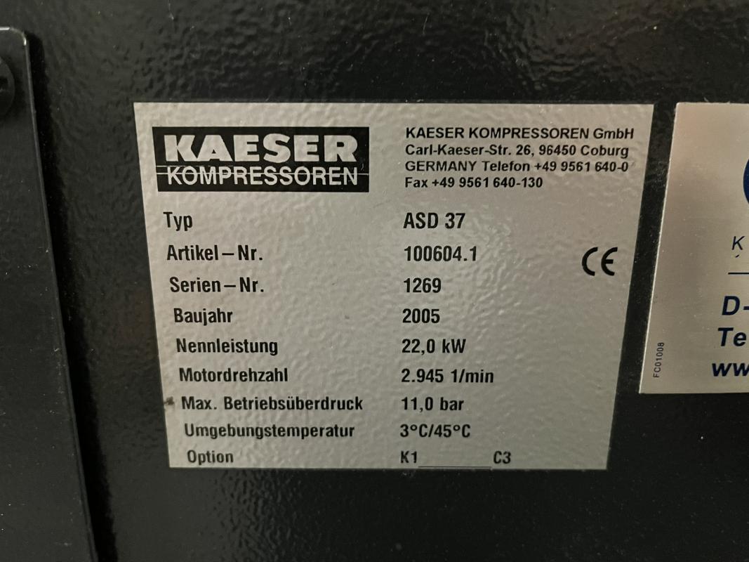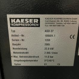 Make: KAESER, Model: ASD37, Year of construction: 2005, Serial no. 1269, 22 kW, 11 bar, Sigma Control control system, Bh run: 51,169/load 35,123