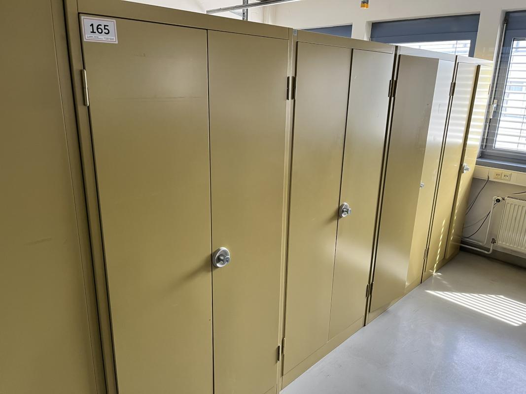 Consisting of: 8 desks, 5 rolling containers, various designs, 8 office swivel chairs, 4 double steel cabinets, yellow, each with 2 hinged doors, cylinder lock