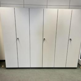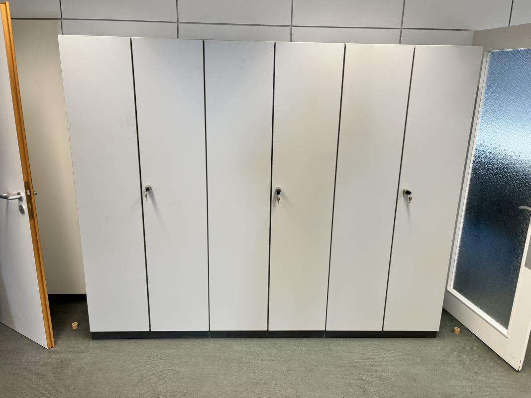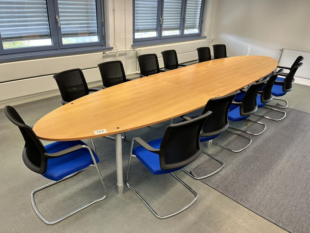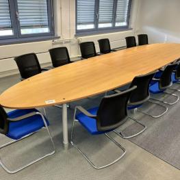 Consisting of: meeting table, oval, 3-piece, length approx. 5 m, 18 cantilever chairs, fabric cover, blue, 3 filing cabinets, each with 2 doors, trapezoidal table, 2 room dividers, manufacturer Ikea, side table