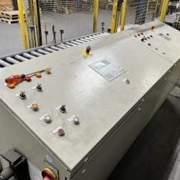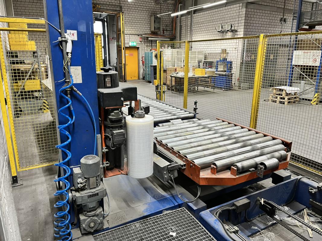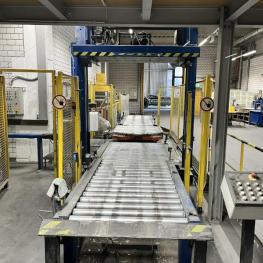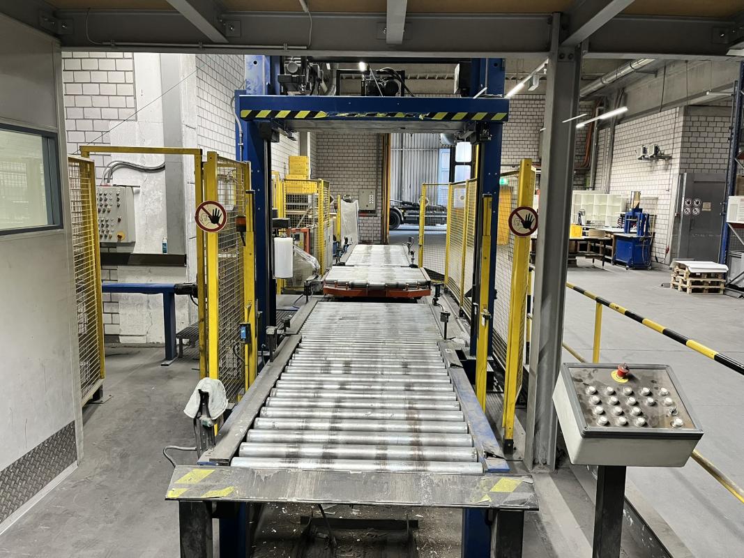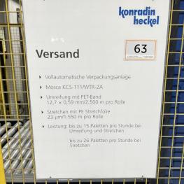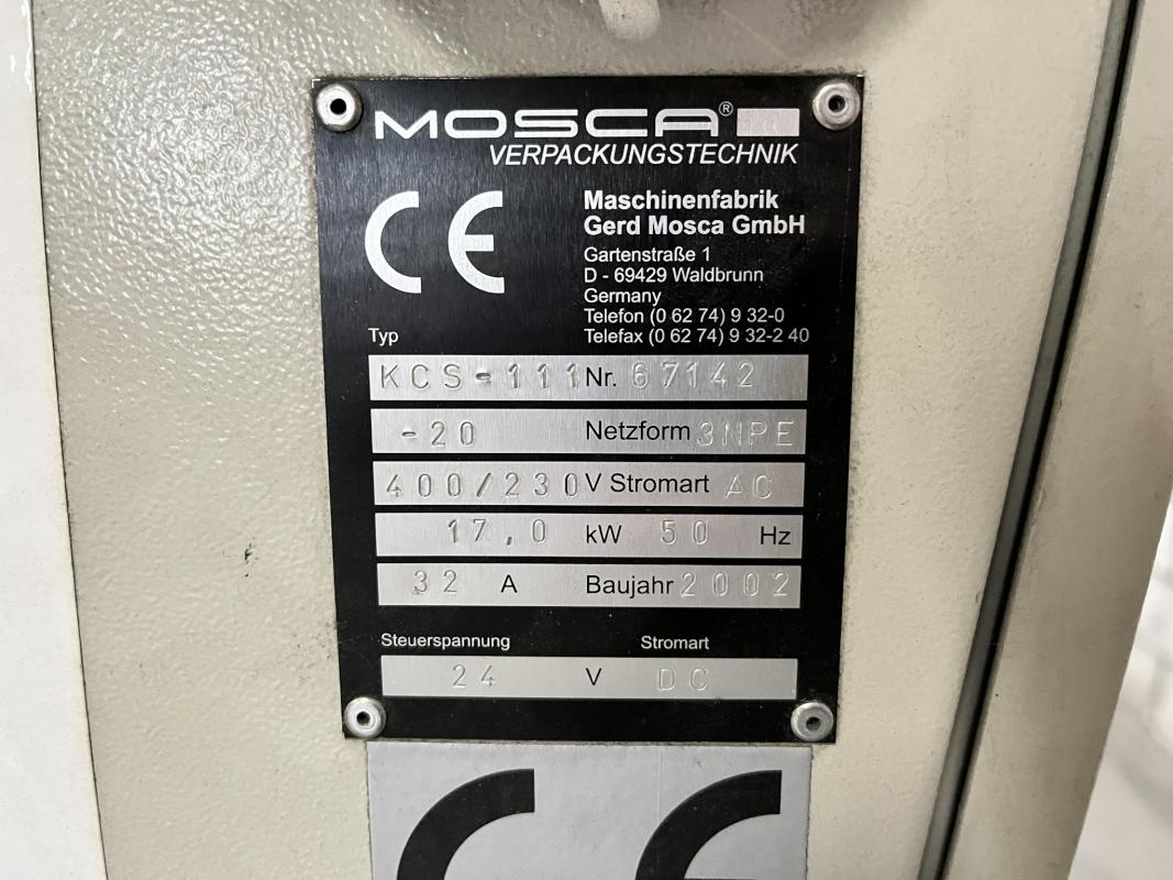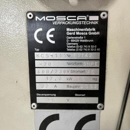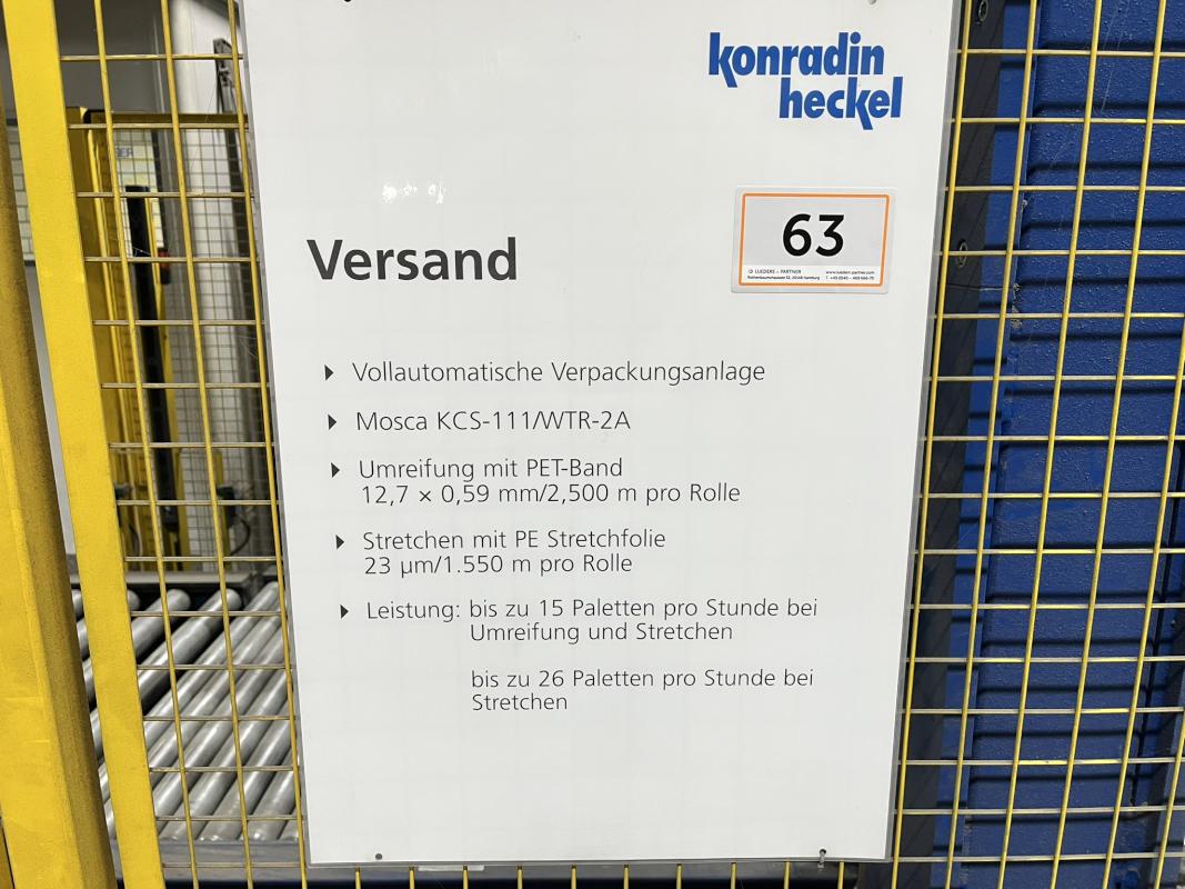 Make: MOSCA, Model: KCS-111/WTR-2A, Year of construction: 2002, 15 pallets/hour with strapping/stretching, up to 26 pallets/hour with stretching, steel roller conveyor for loading/unloading, safety light barrier, protective fence