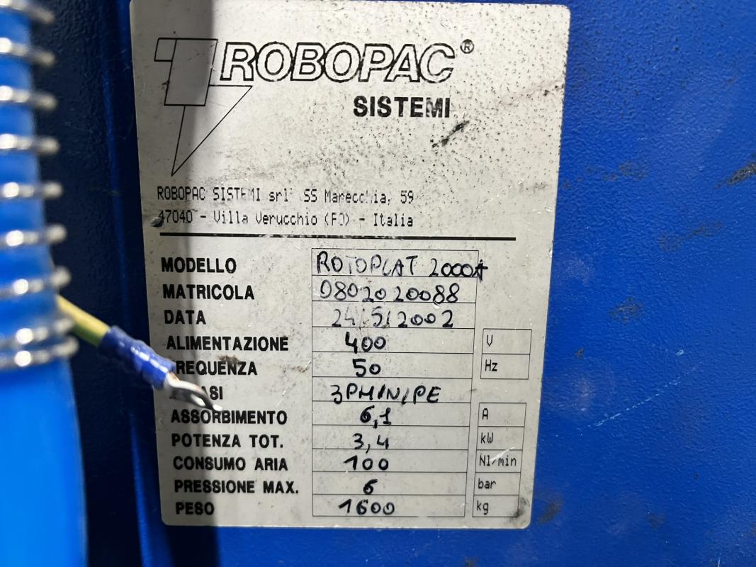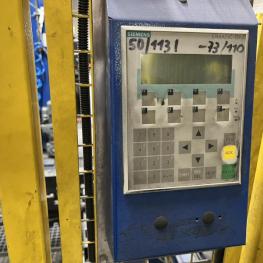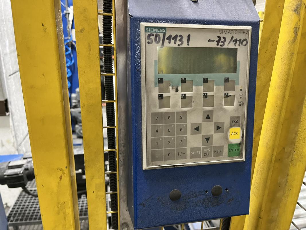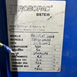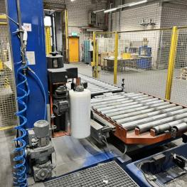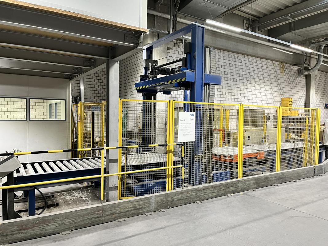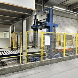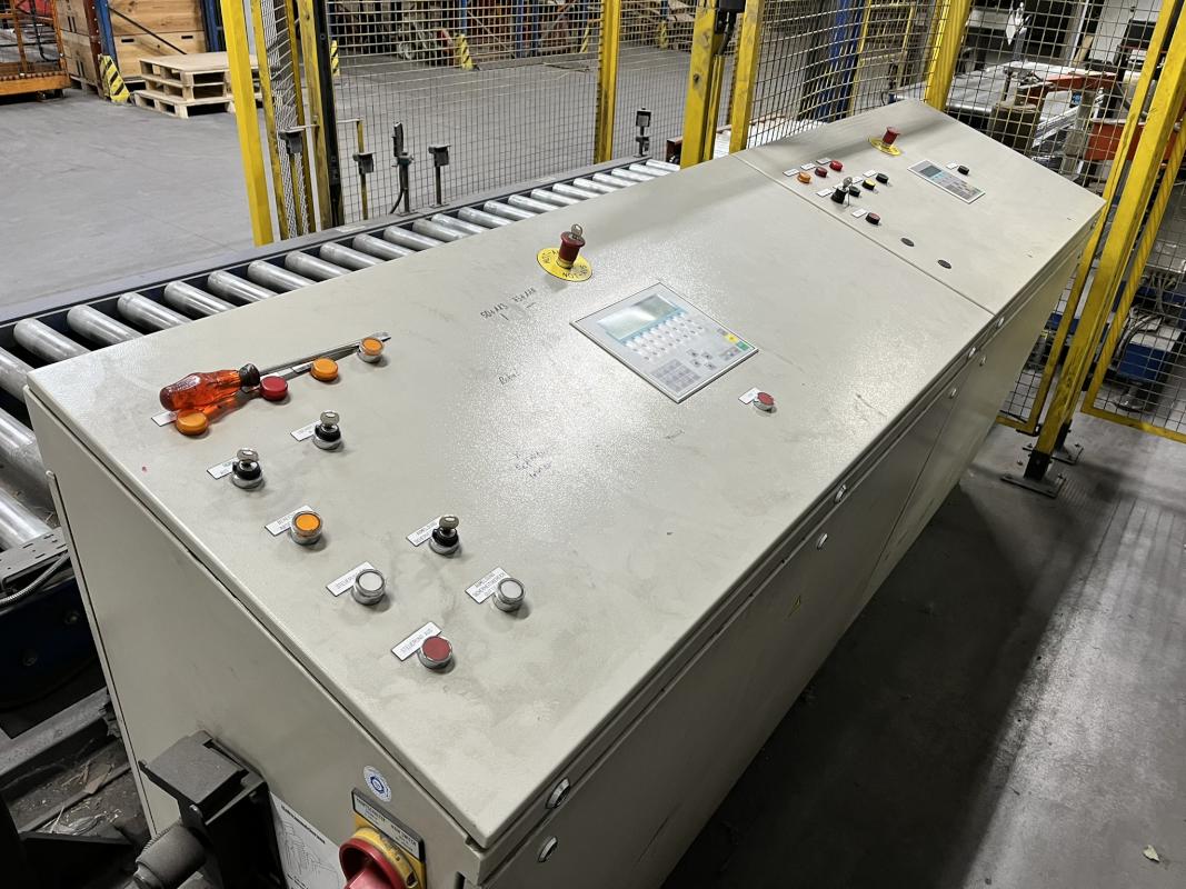 Make: MOSCA, Model: KCS-111/WTR-2A, Year of construction: 2002, 15 pallets/hour with strapping/stretching, up to 26 pallets/hour with stretching, steel roller conveyor for loading/unloading, safety light barrier, protective fence