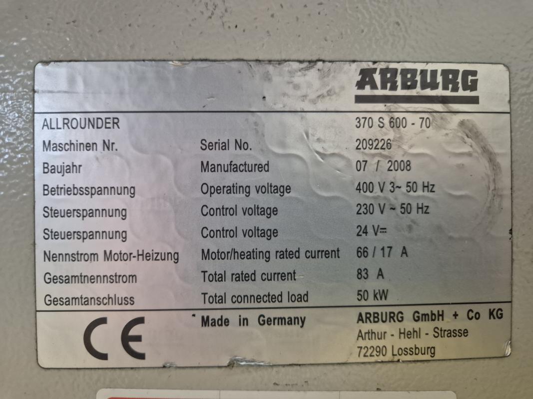 Make: ARBURG, Model: Allrounder 370S-600-70, Year of construction: 2008, Serial no. 209226, control system, manufacturer Arburg, type Selogica, clamping force 600 kN,screw diameter 18 mm, sprue picker