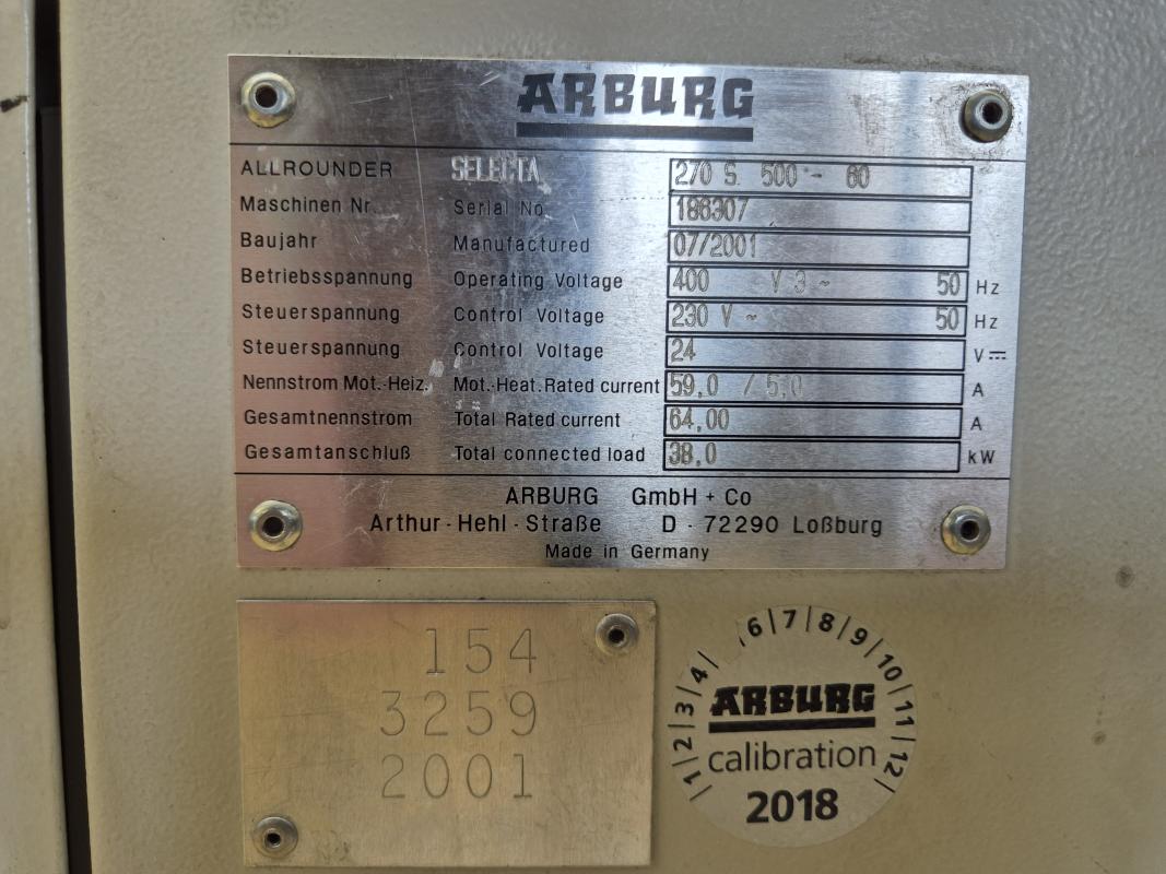 Make: ARBURG, Model: Allrounder 270S-500-60, Year of construction: 2001, Serial no. 188307, Selogica control system, clamping force 500 kN, screw diameter 18 mm
