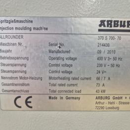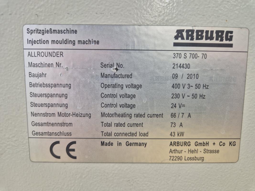 Make: ARBURG, Model: Allrounder 370S-700-70, Year of construction: 2010, Serial no. 214430, Arburg Selogica direct control system, clamping force 70 t,screw diameter 18 mm