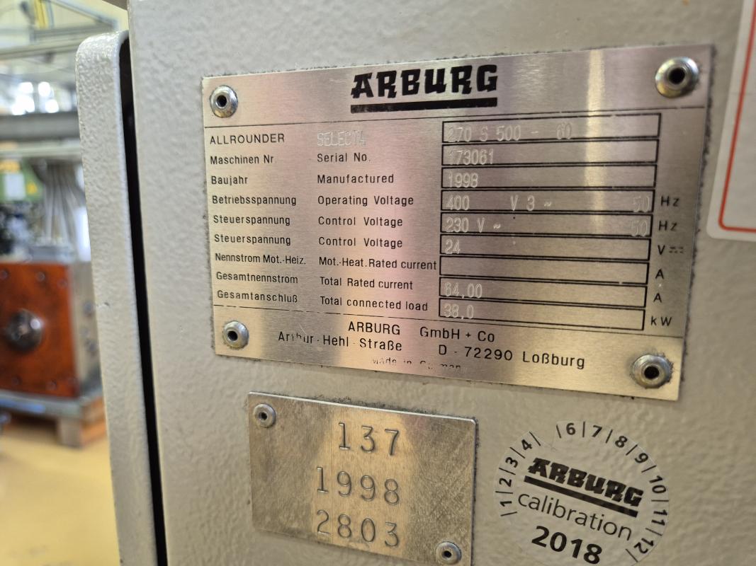 Make: ARBURG, Model: Allrounder 270-S-500-60, Year of construction: 1998, Serial no. 173061, control system, manufacturer Arburg, type Selogica, clamping force 500 kN,screw diameter 18 mm, not in operation