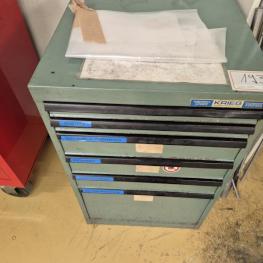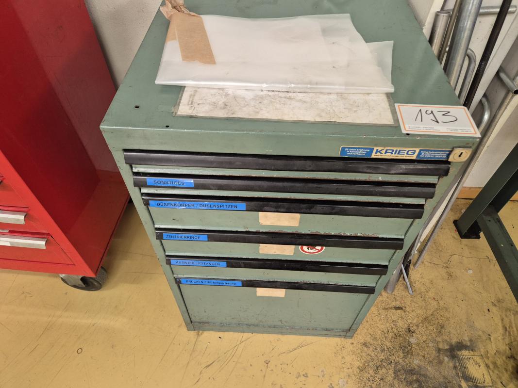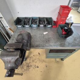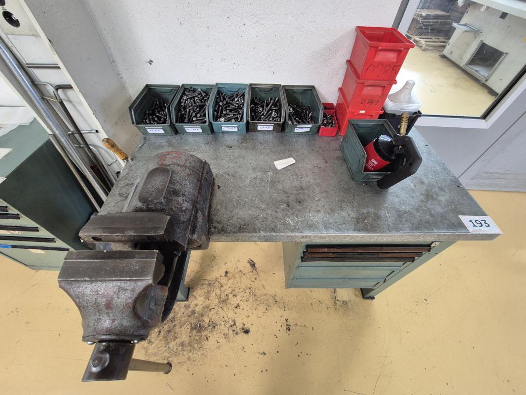 Make: KRIEG, 6 drawers, contents: clamping devices, workbench, manufacturer Krieg, 5 drawers approx. 1300x700mm, vice jaw width 125mm, manufacturer Leinen