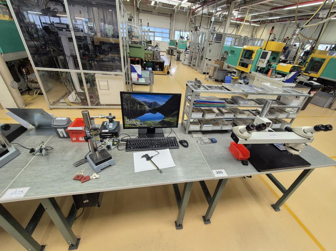 Consisting of: Stereomicroscope, Leica, small measuring table, Mitutoyo, controller with 8 channels, 1 digital micrometer, digital dial gauge, TFT monitor, keyboard, mouse