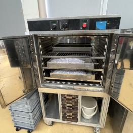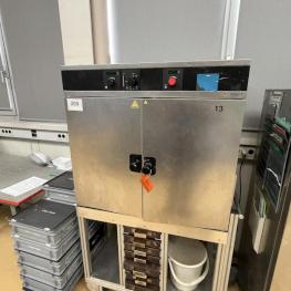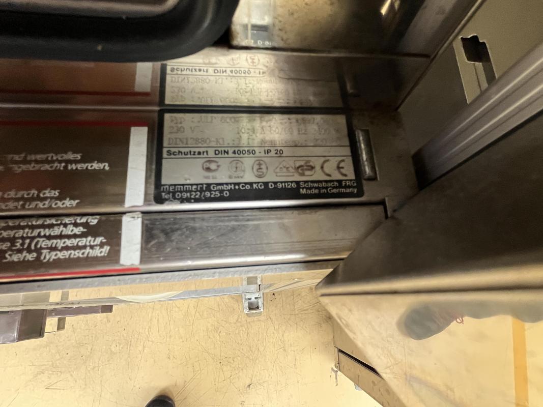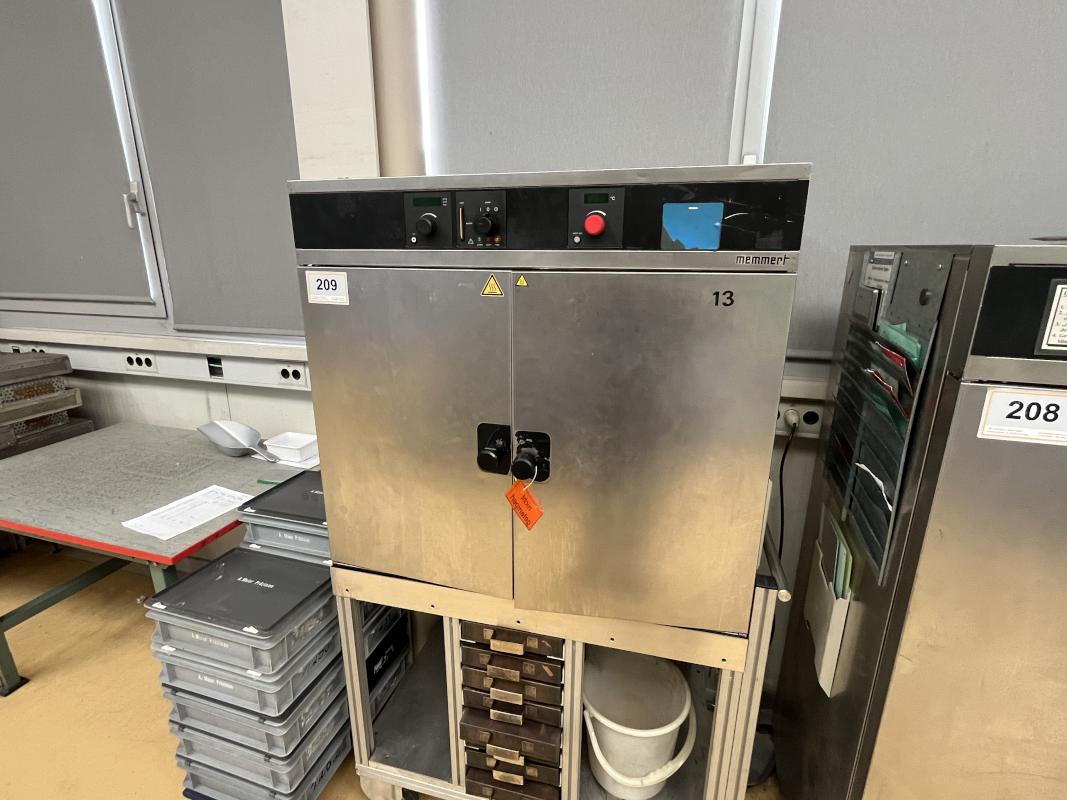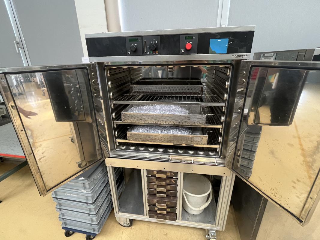 Make: MEMMERT, Model: ULP600, Temperature max. 200° C, interior W/D/H 800 x 500 x 650 mm, 2 doors, digital display for temperature program, card slot, equipment trolley made of aluminum system profiles