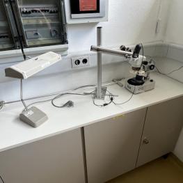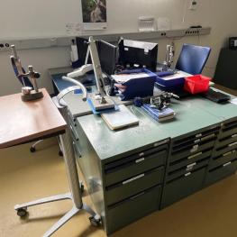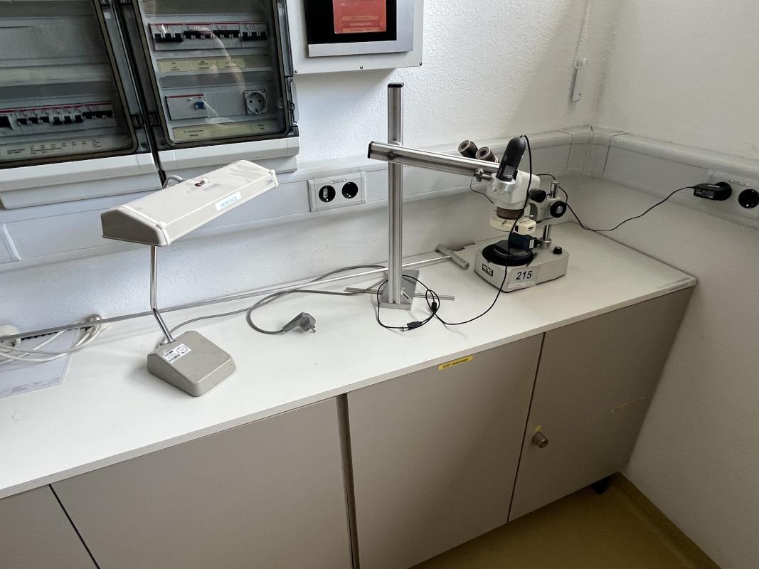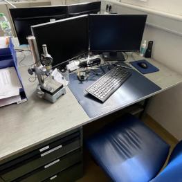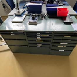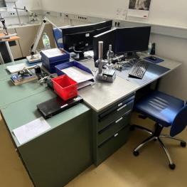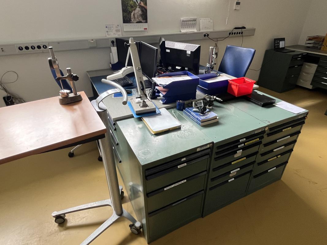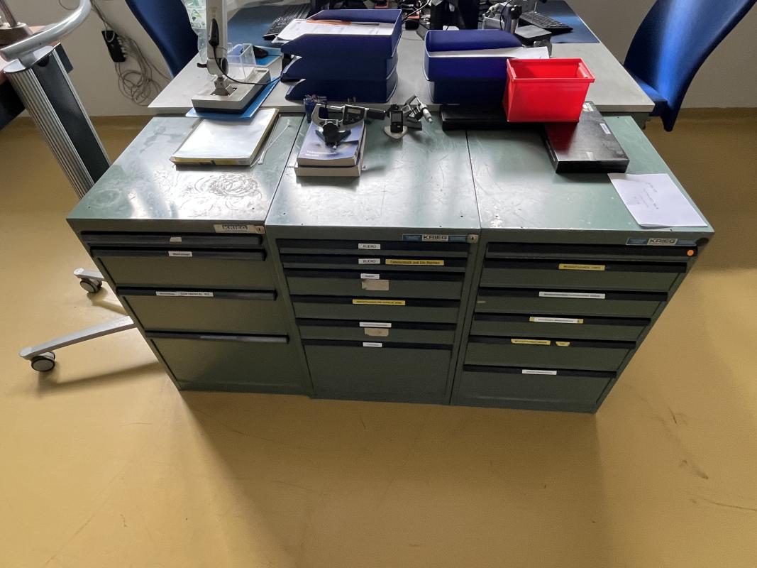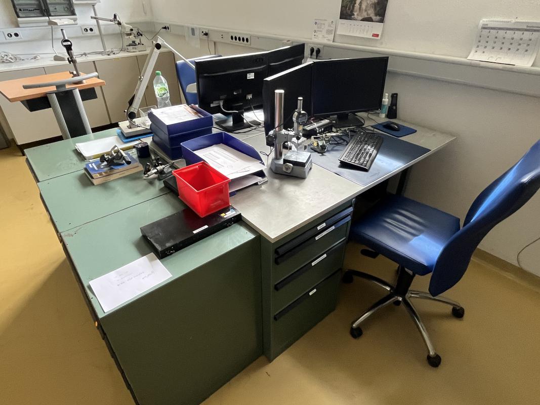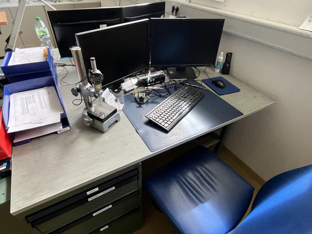 Measuring workstation, consisting of: small magnetic measuring stand, manufacturer Mitutoyo, digital measuring probe, manufacturer Mitutoyo, digital micrometer, small camera, manufacturer Digi Mikro, with stand, 2x 22" monitors, keyboard, mouse, 2x office desks incl. base units with 4 drawers each, 3 drawer cabinets, made by Krieg Contents: hand tools, test pins, measuring fixtures
