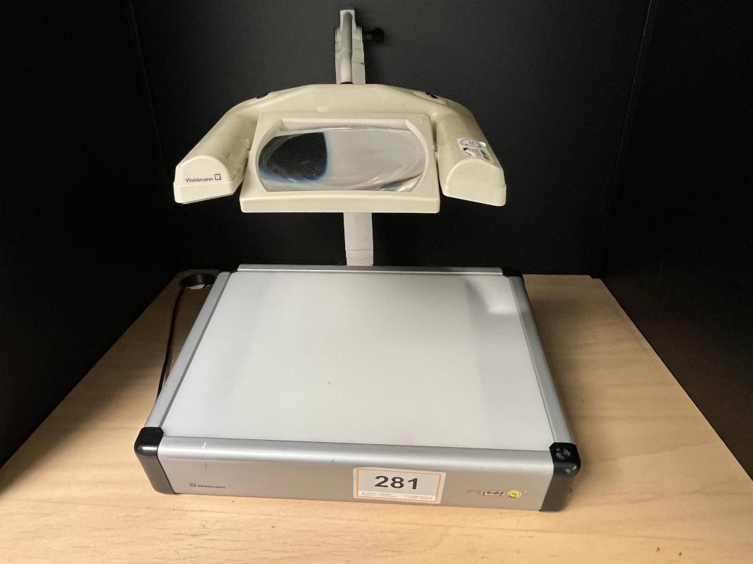 Test workstation, consisting of: light table, magnifying lamp, each from Waldmann, enclosure