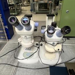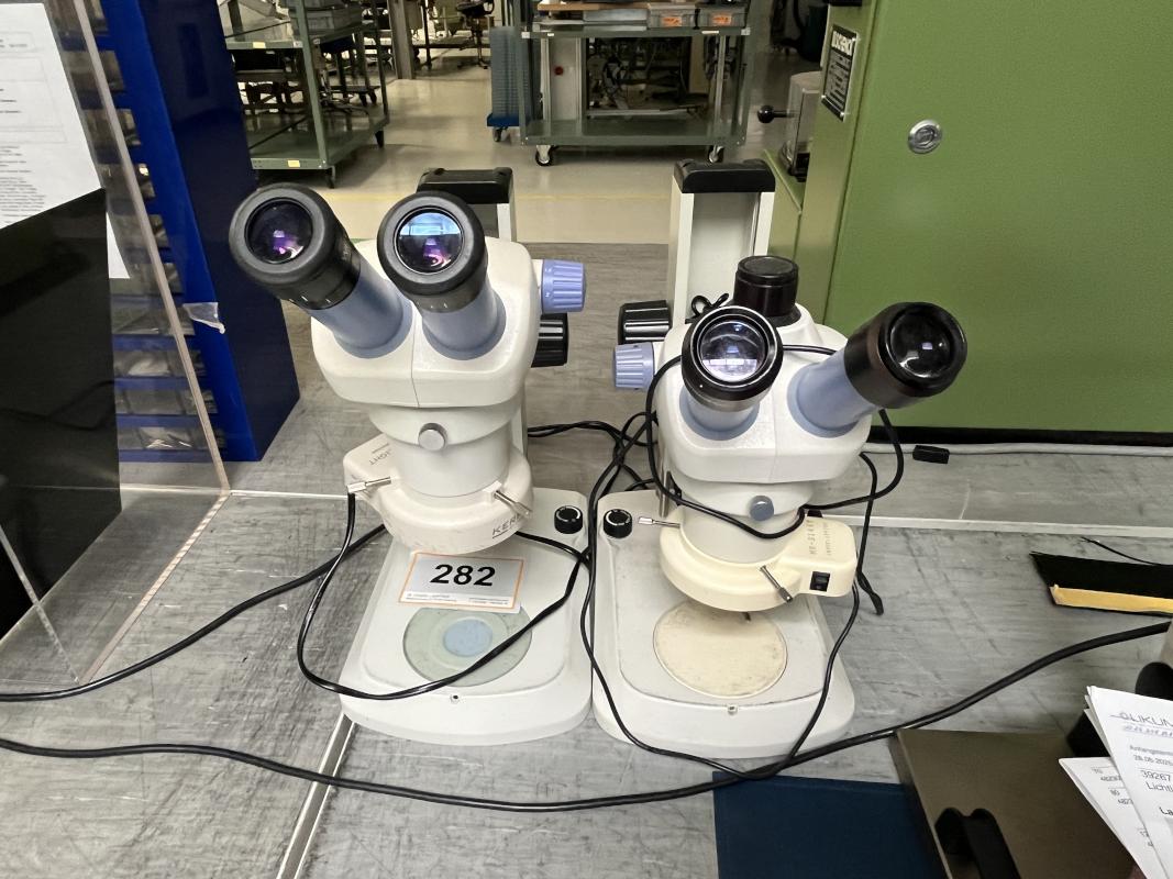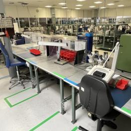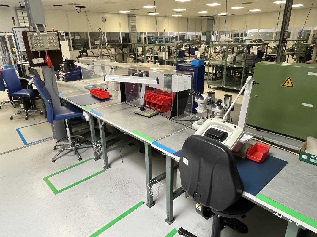 Assembly/inspection workstations, consisting of: 11 work tables, 8 swivel chairs, 1 magnifying lamp, 2 table lamps, Waldmann, 2 stereo microscopes