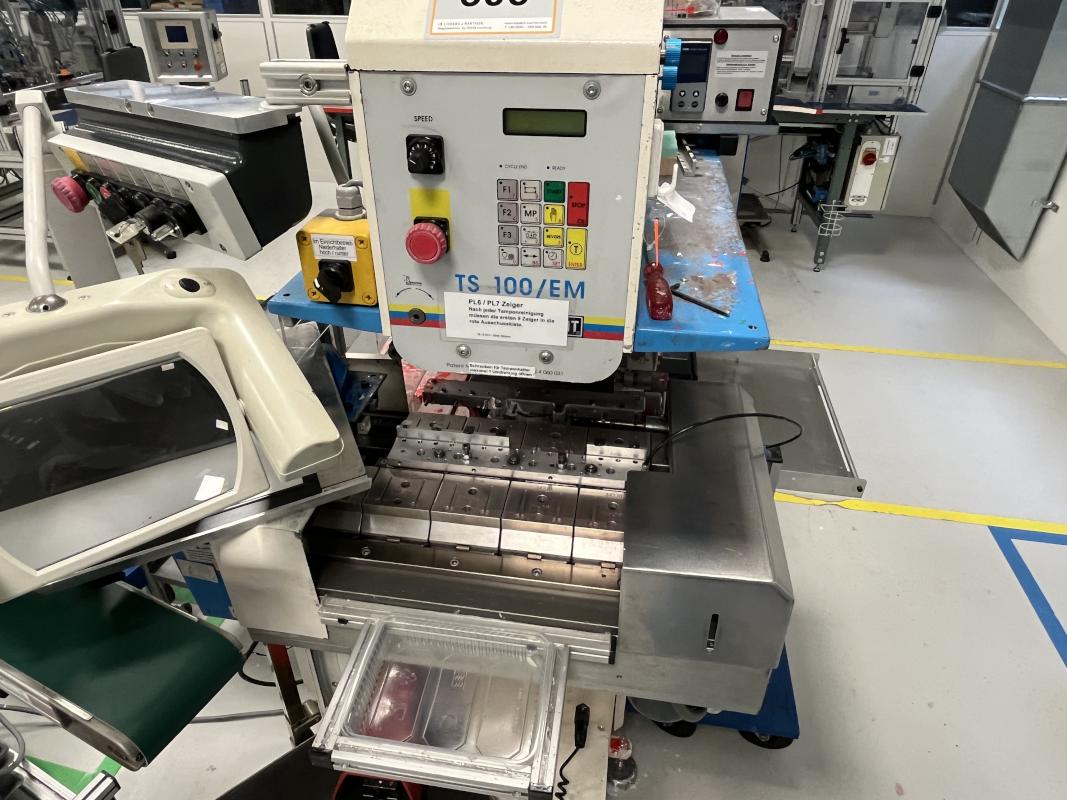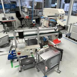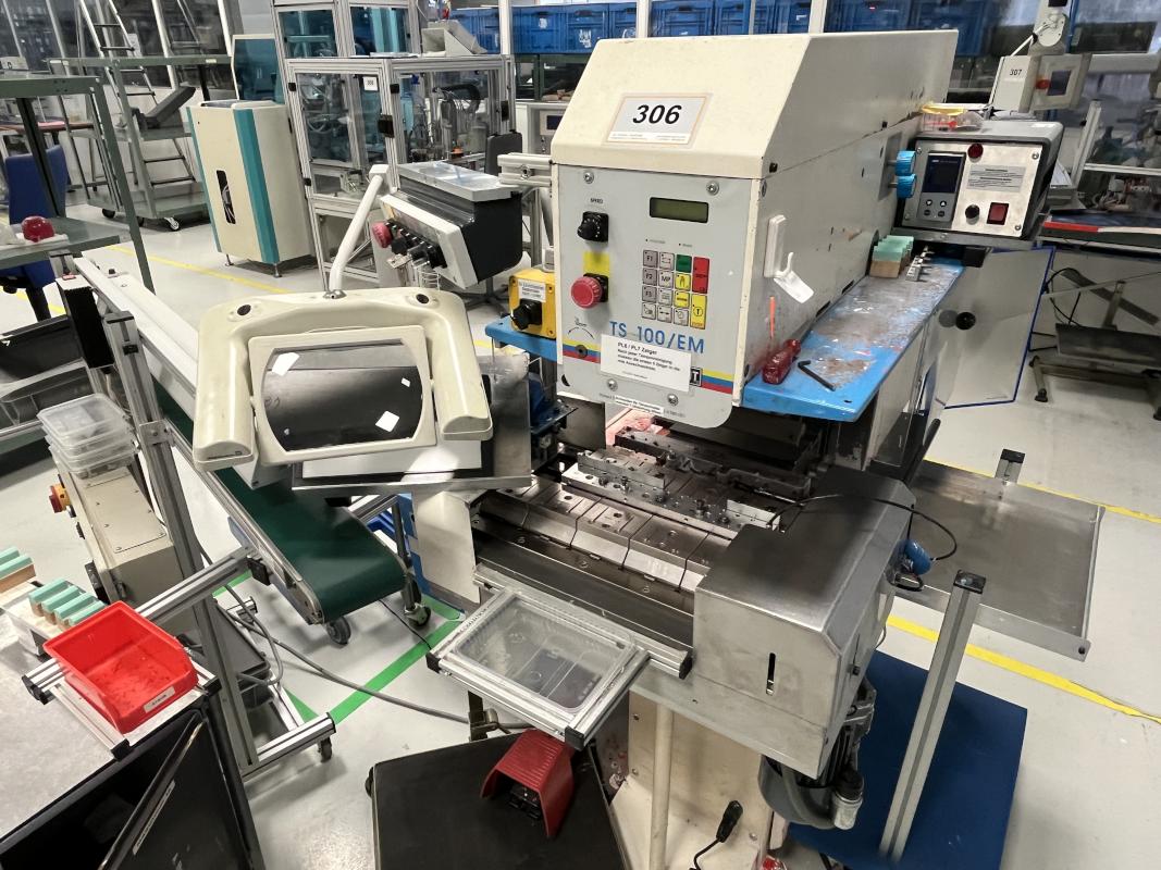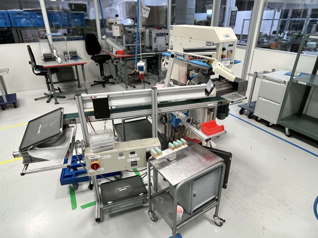 pad printing workstation (38), consisting of: pad printing machine, made by Tampoprint, type TS100/EM, built in 2003, serial no. 101, magnifying lamp, inspection lamp, driven parts removal conveyor, infrared lamp,