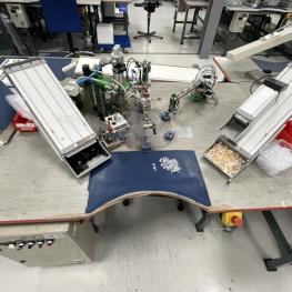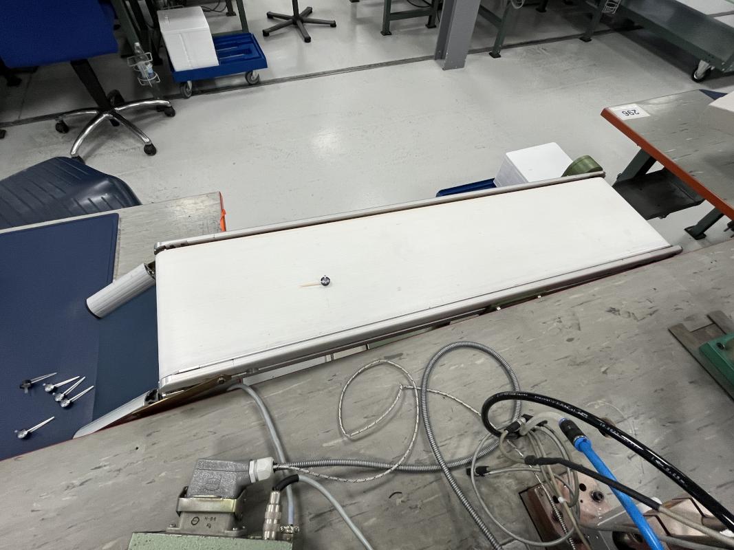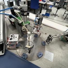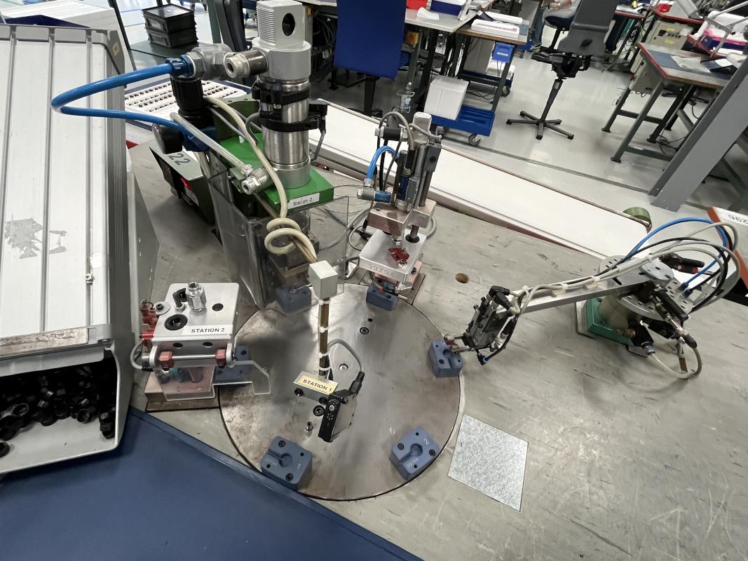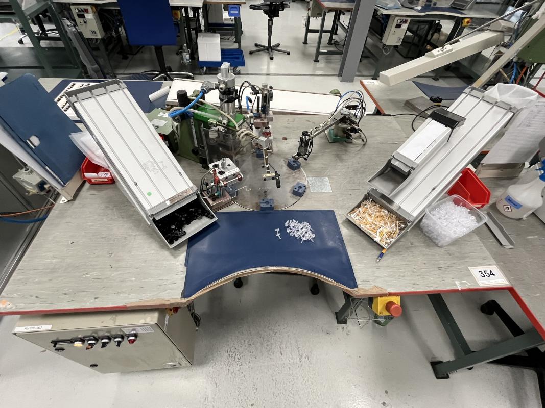 Assembly work tables, 6-fold rotary table, 5 stations, 2 handle bowls, hot runner control device, manufacturer Hoss, parts removal belt, 2 small parts chutes, assembly station 3,