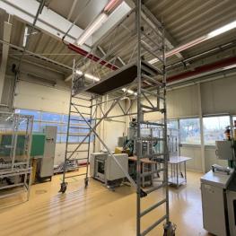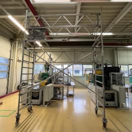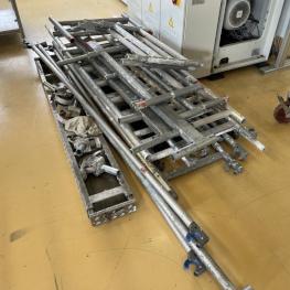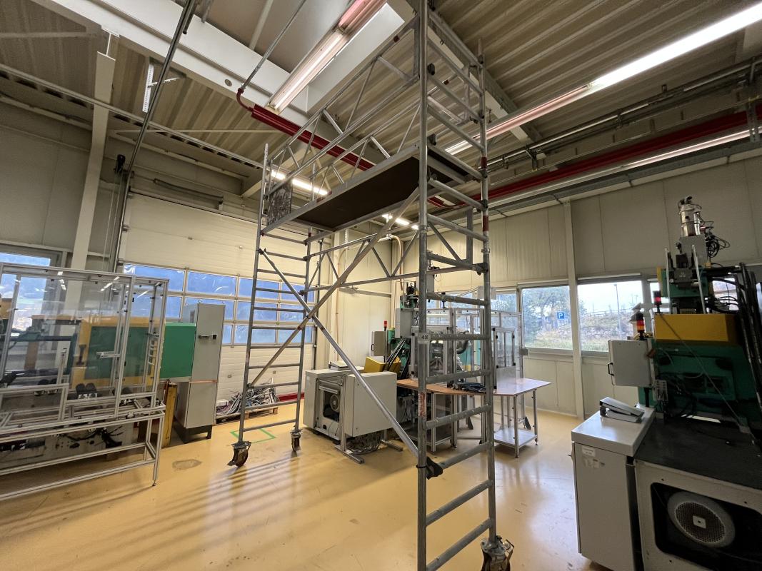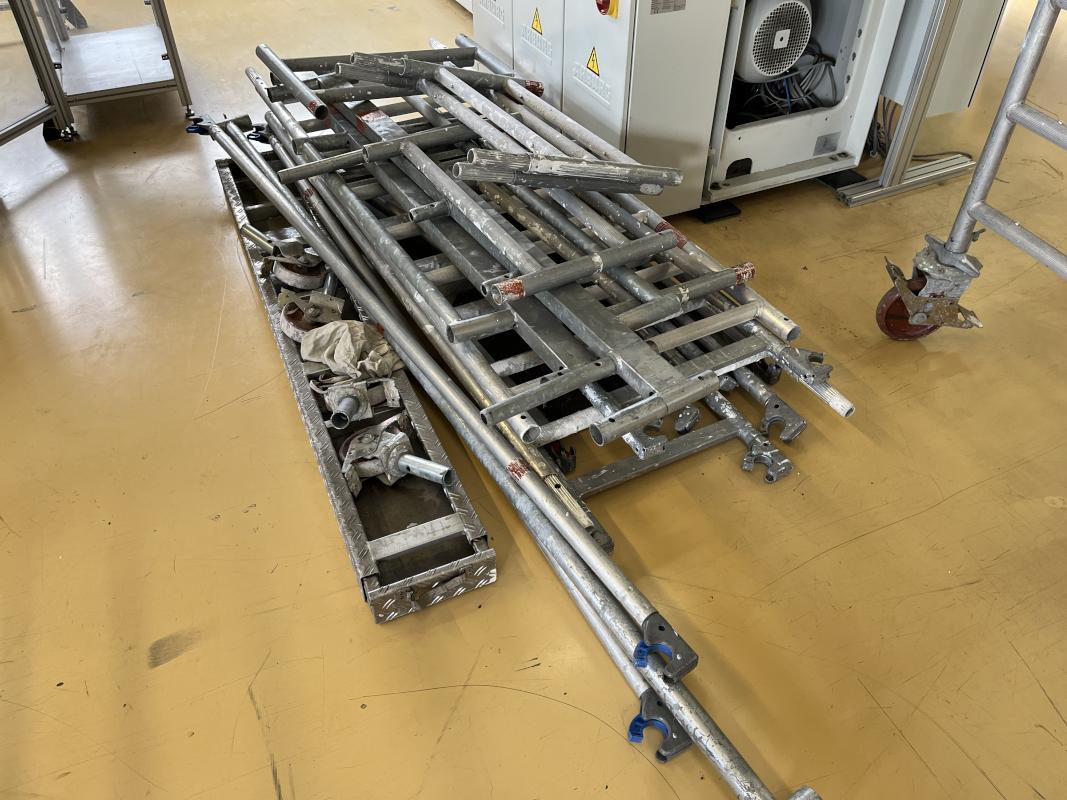 Make: LAYHER, Year of construction: 1994, WDH 2900mmx748mmx4000mm, consisting of: 4 uprights, 2 crossbars, 3x fall protection, 1x bridge with opening, rollable, permissible load 1.5 kN/m, incl. 1 lot of scaffolding elements mainly consisting of 2 uprights, 1 floor, 4 wheels, fall protection, cross braces