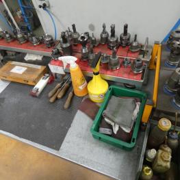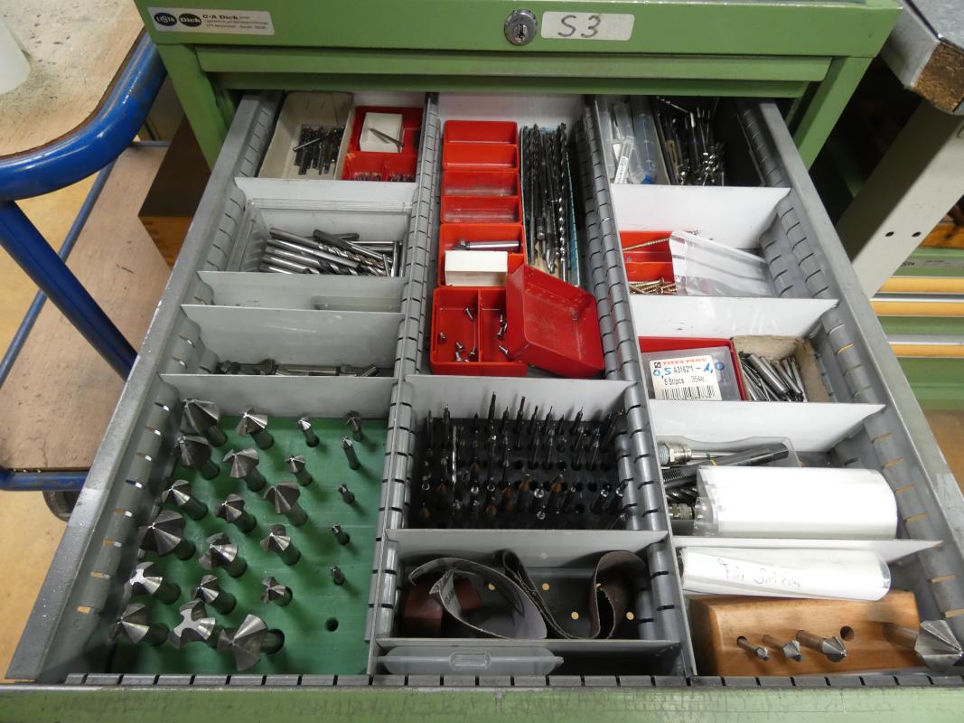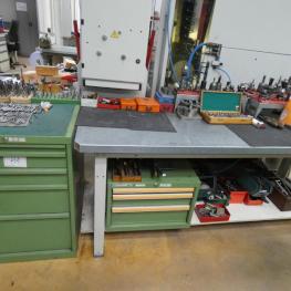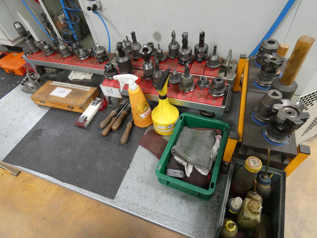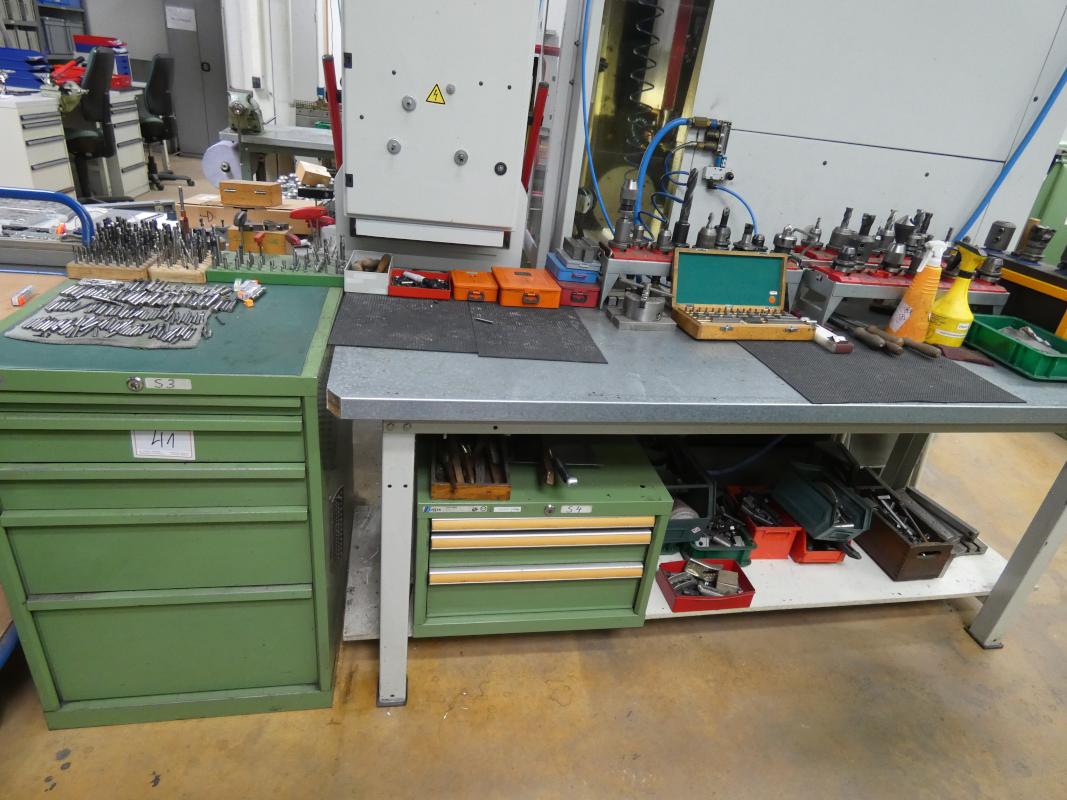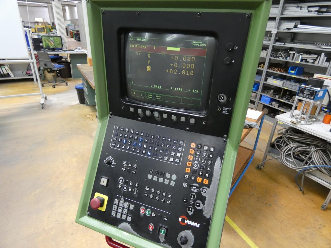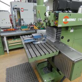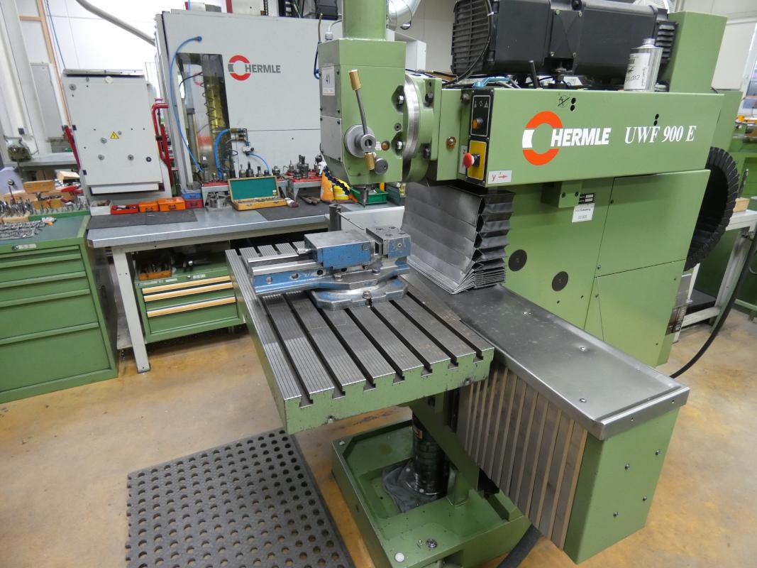 Make: HERMLE, Model: UWF900E, Year of construction: 1991, Ser. No. 9569, CNC control, manufacturer Heidenhain, travel distances X/Y/Z 600x400x400mm, SK40 mount, max. speed 4000 rpm, infrared 3D measuring probe, milling head manually rotatable +-90 degrees, rotatable drill vise, accessories ordered from: tool drawer cabinet, manufacturer Lista Dick contents, milling cutters, HSS drills, 4 tool holders, equipped with approx. 30 SK 40 holders, 1x workbench, 1 three-jaw chuck Röhm diameter 100mm, gauge block set