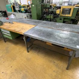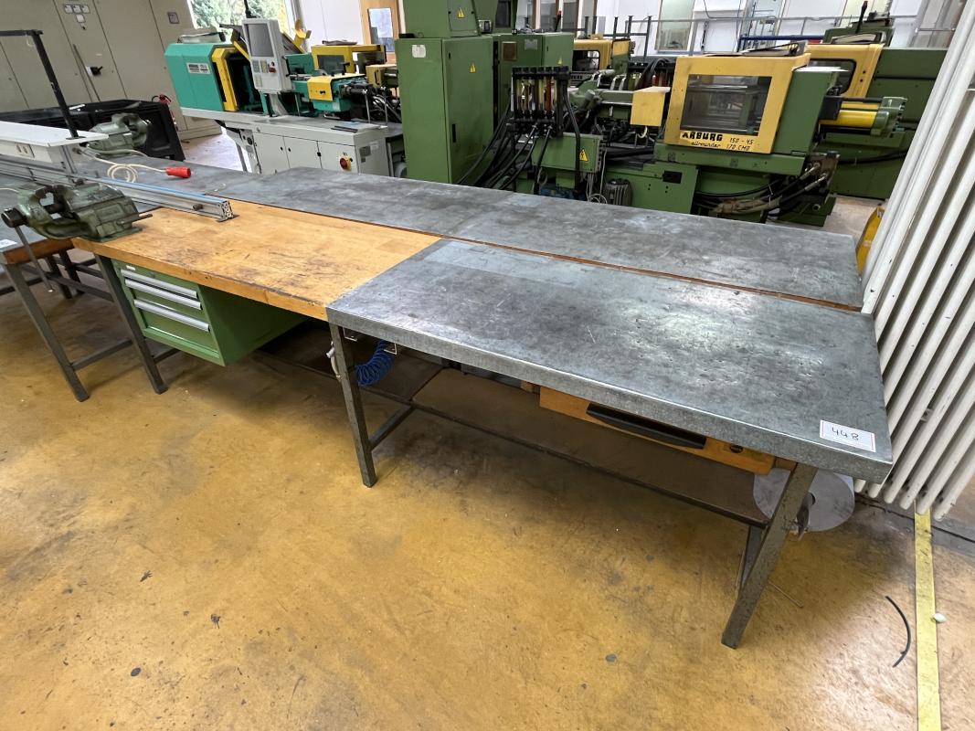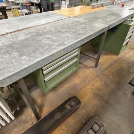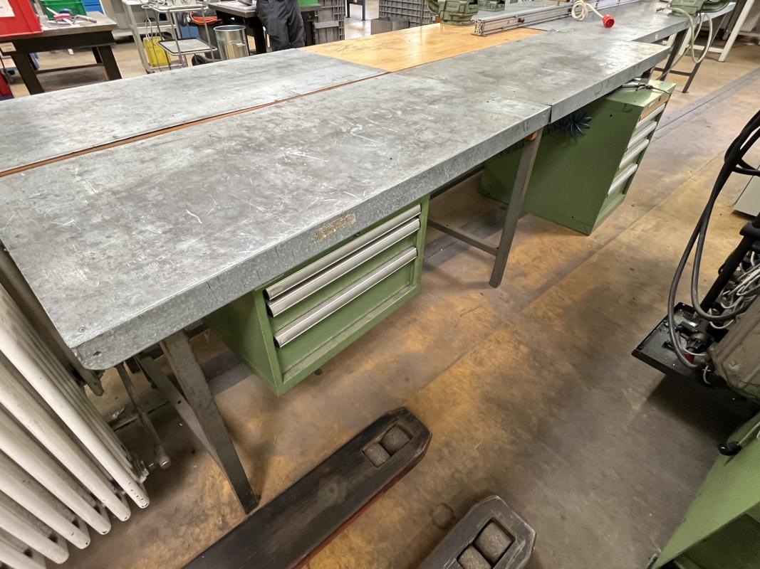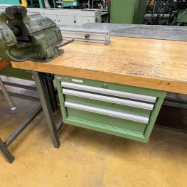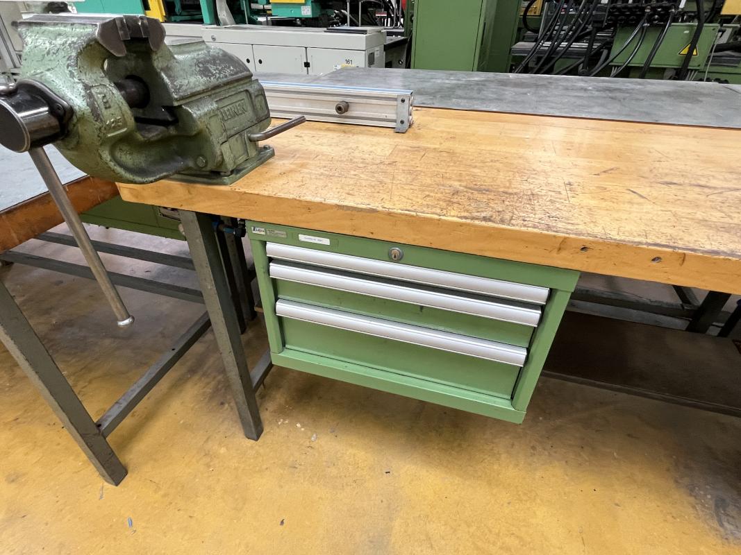 consisting of: 2x workbench, manuf. Lista, with base each 3 drawers, partly sheet metal top, 1x telescopic drawer cabinet, manuf. Lista, 5 drawers, 1 vise manuf. Leinen Type 125, without contents