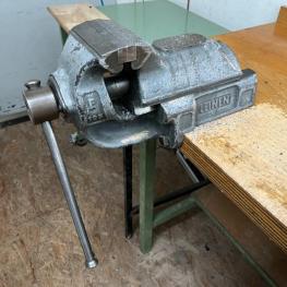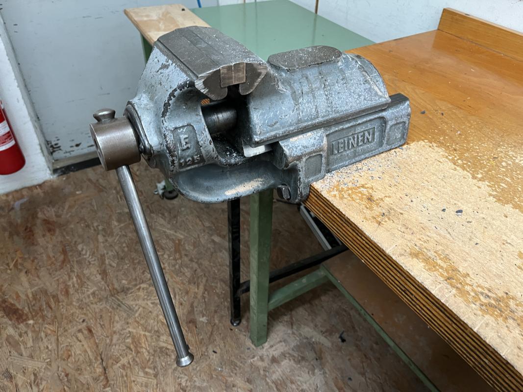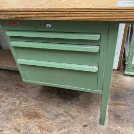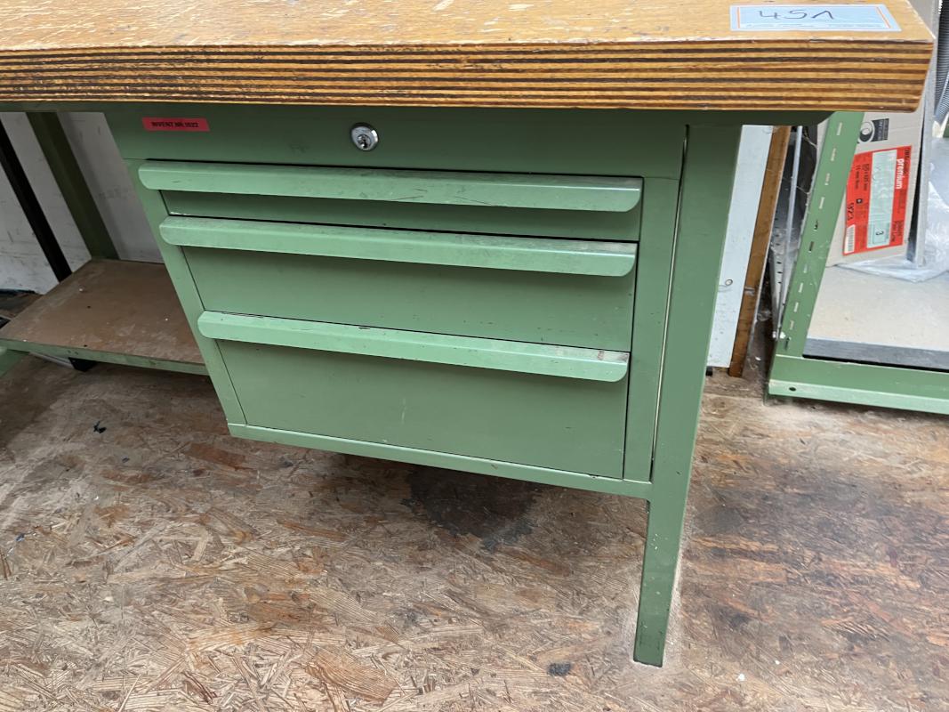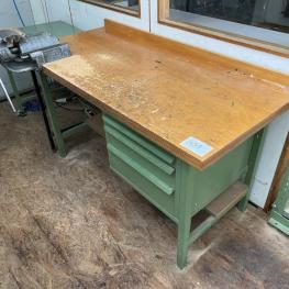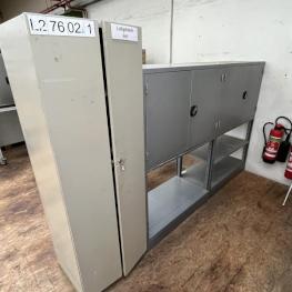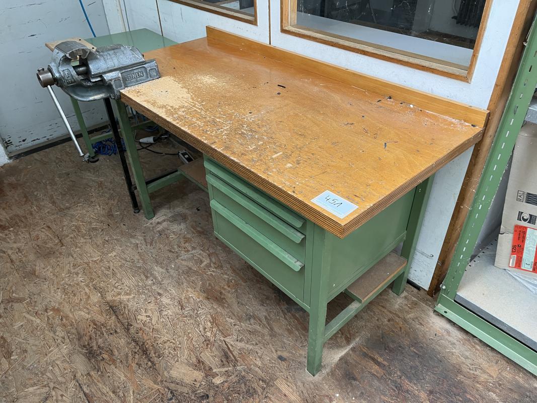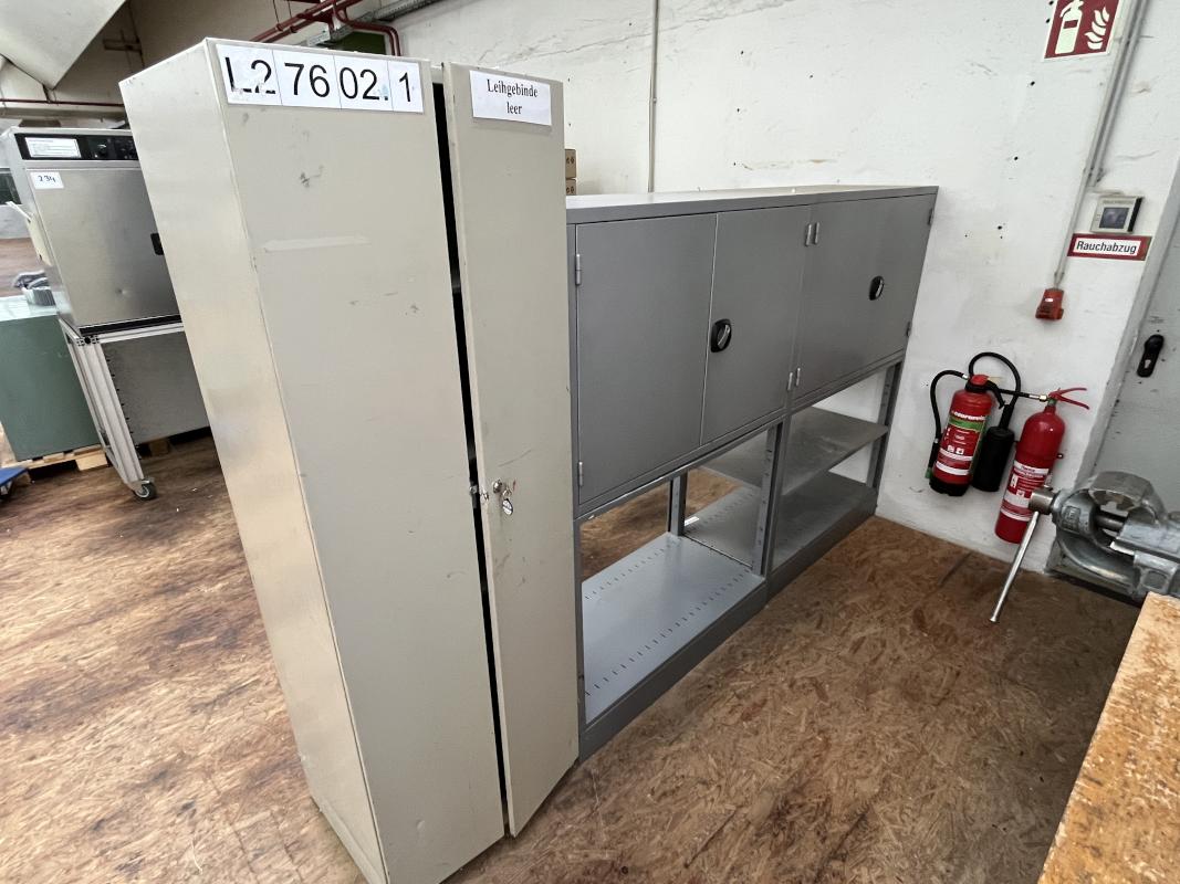 consisting of: 1x workbench incl. base 3 drawers, 1x vise manuf. Leinen, 2x sheet metal cabinets, manuf. Schäfer, 2x metal shelves, 1x sheet metal cabinet 2-door, without contents
