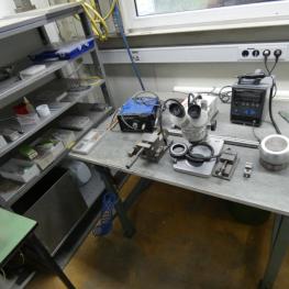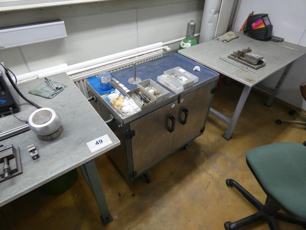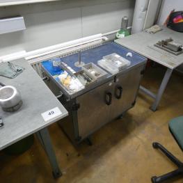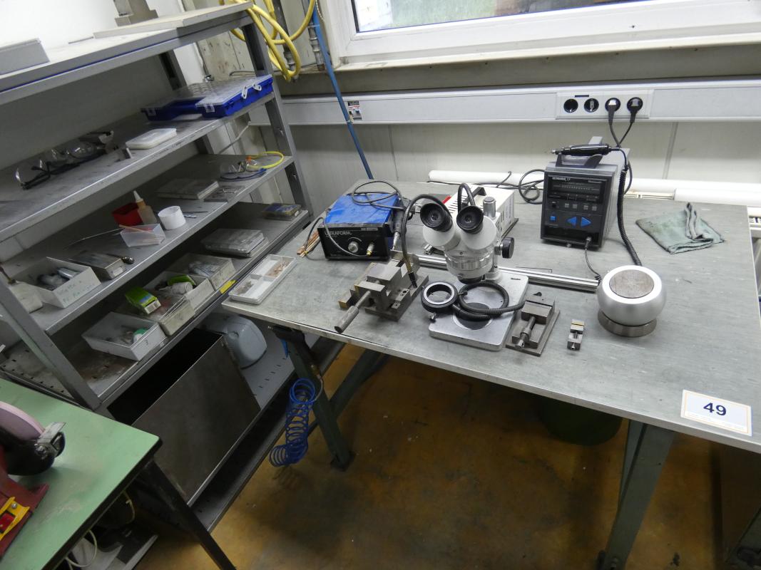 Grinding workstation, consisting of: workshop microscope, manufacturer Will, double cold light source, electric grinder, manufacturer Gesswein, control, manufacturer Ultramax DF, electric grinder Ultraform, 3 small precision vices, small magnetic plate, 2 work tables, swivel chair, assembly trolley, 2 doors, 1 plug-in shelf, 5 levels