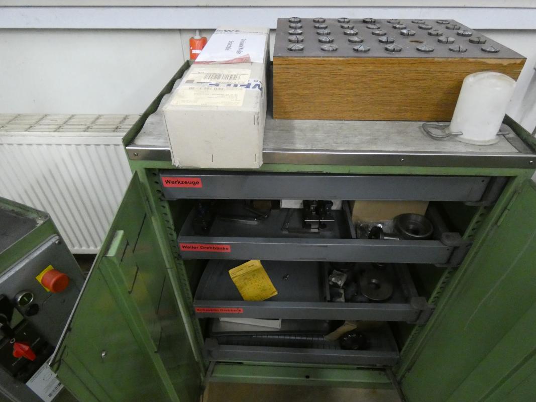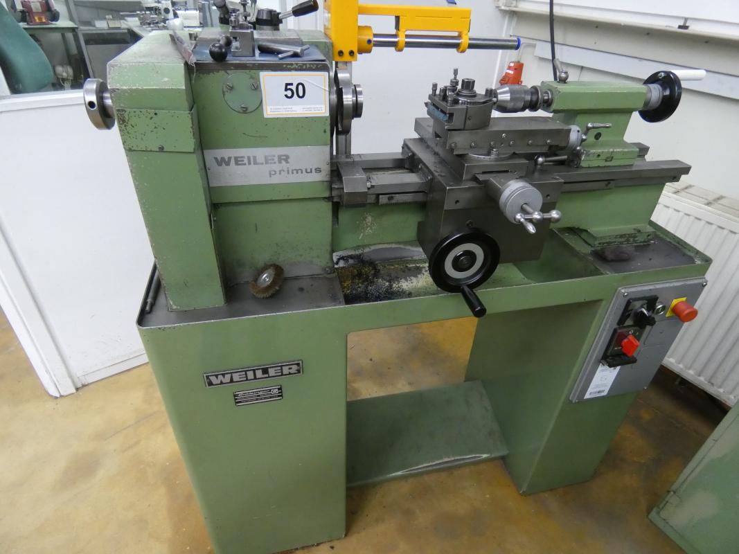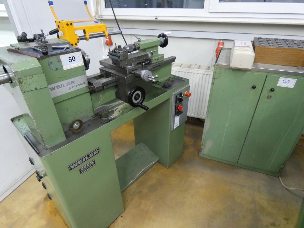 Make: WEILER, Model: Primus, Year of construction: 1979, Speed max. 3000 rpm, center height approx. 120 mm, turning length approx. 350 mm, tailstock, Multifix steel holder, accessory cabinet Contents: 3 jaw chucks diameter 100 mm, steel holders approx. 4, 1 set of clamping sleeves