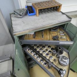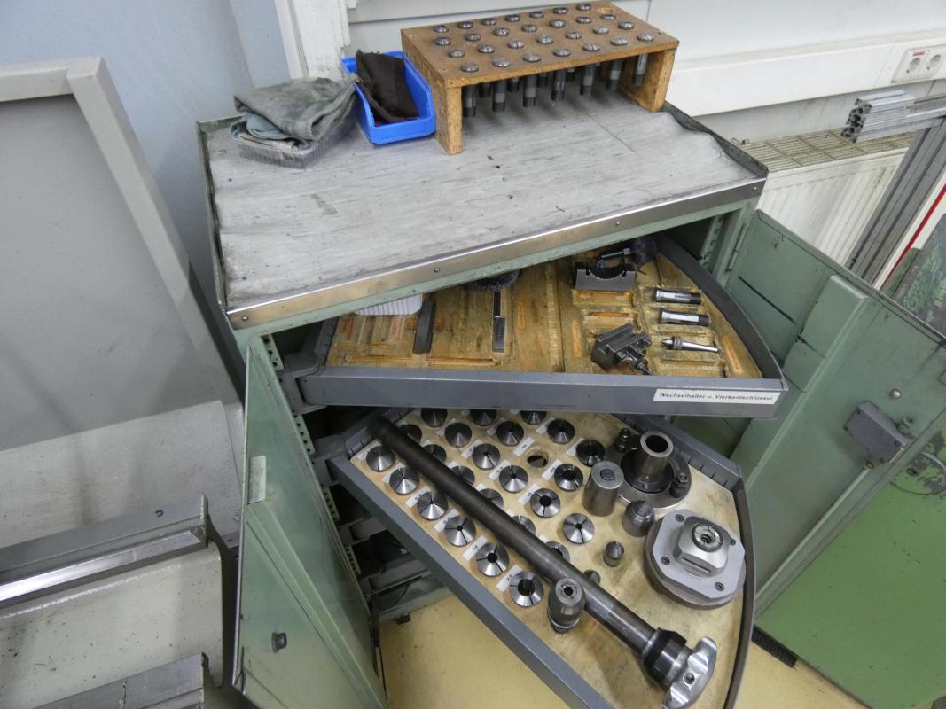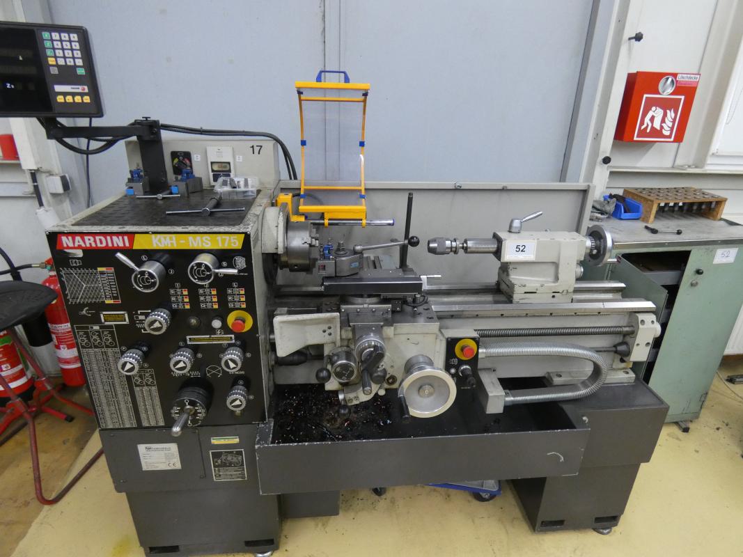 Make: NARDINI, Model: KMH-MS175, Year of construction: 1995, Serial no. D5JEV031, max. speed 2500 rpm, center height 175 mm, turning length approx. 600 mm, Multifix steel holder, approx. 3 holders, three-jaw chuck tailstock, digital display, manufacturer Fagor, tool cabinet, 2 doors, contents: 1 set of collets, collet clamping bar