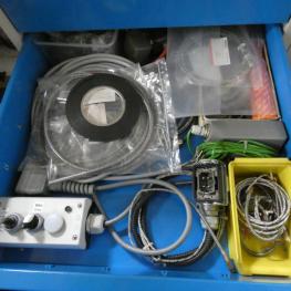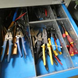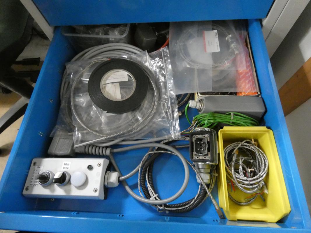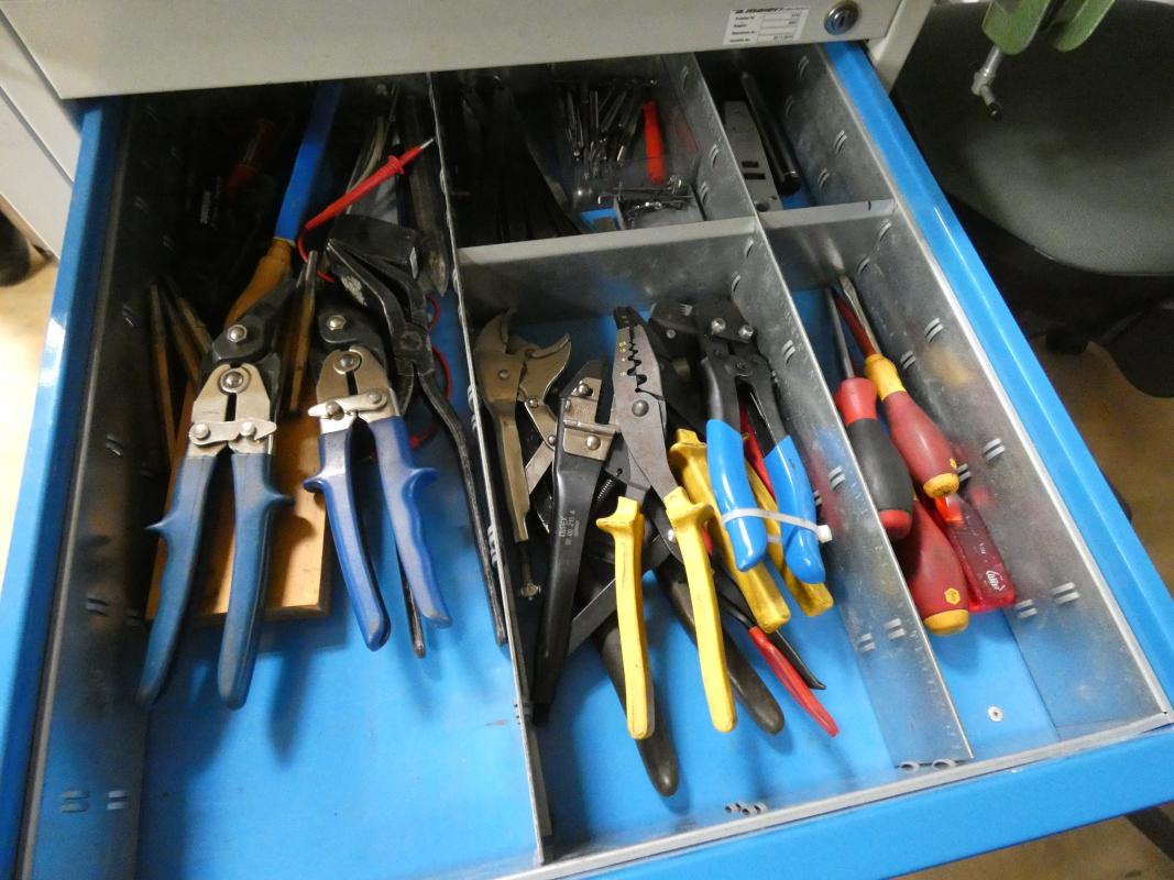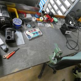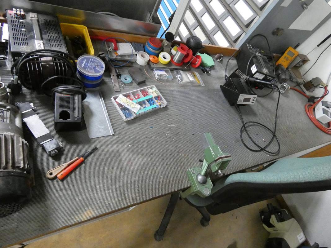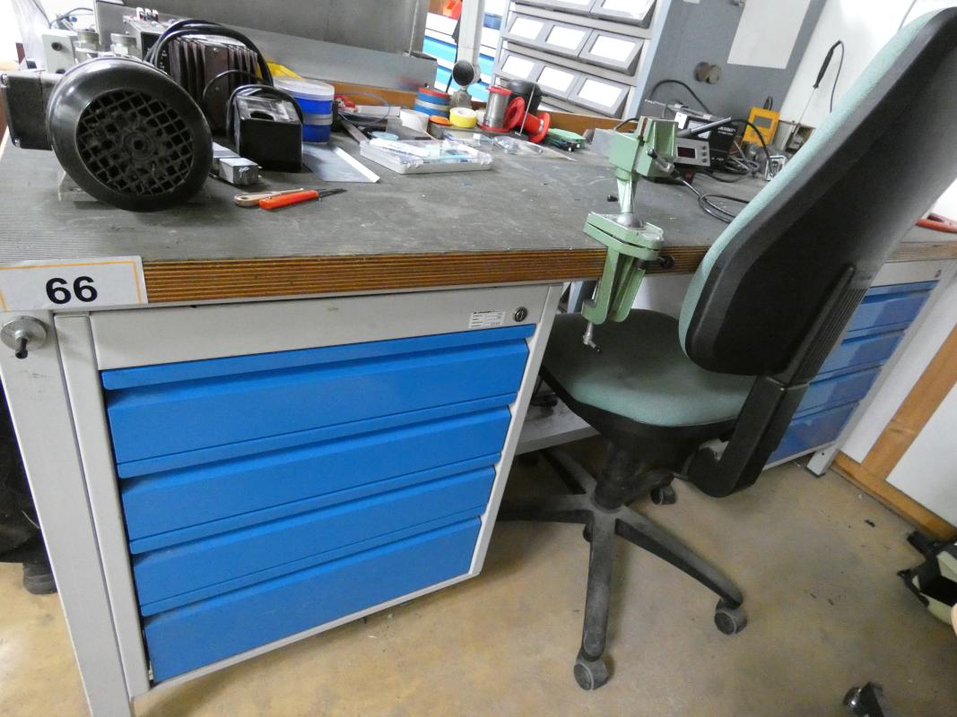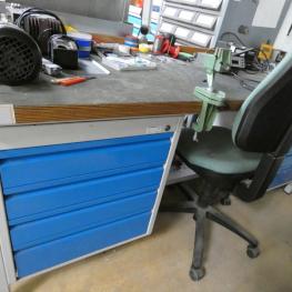 Workbench 2x base units, each with 4 pull-out drawers Contents: Hand-held electrical tools (wire strippers, crimping pliers, etc.) Soldering workstation, consisting of: Soldering station, Ersa Digital 2000A 2x Labnorn power supply unit, Voltcraft