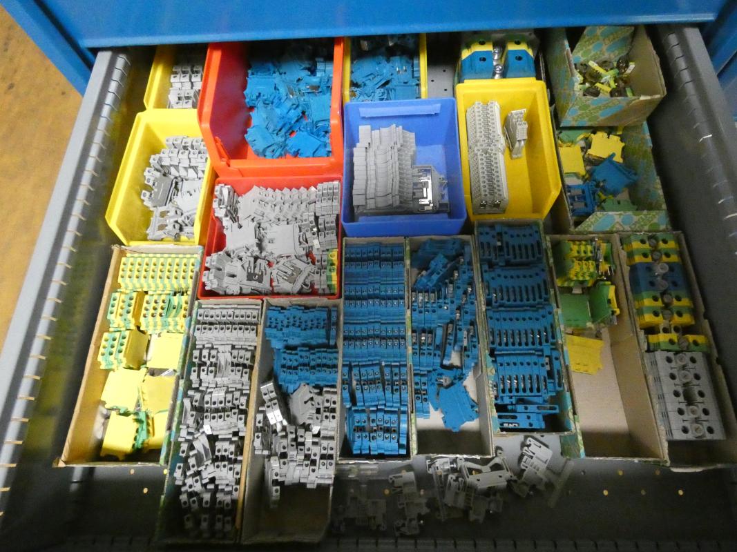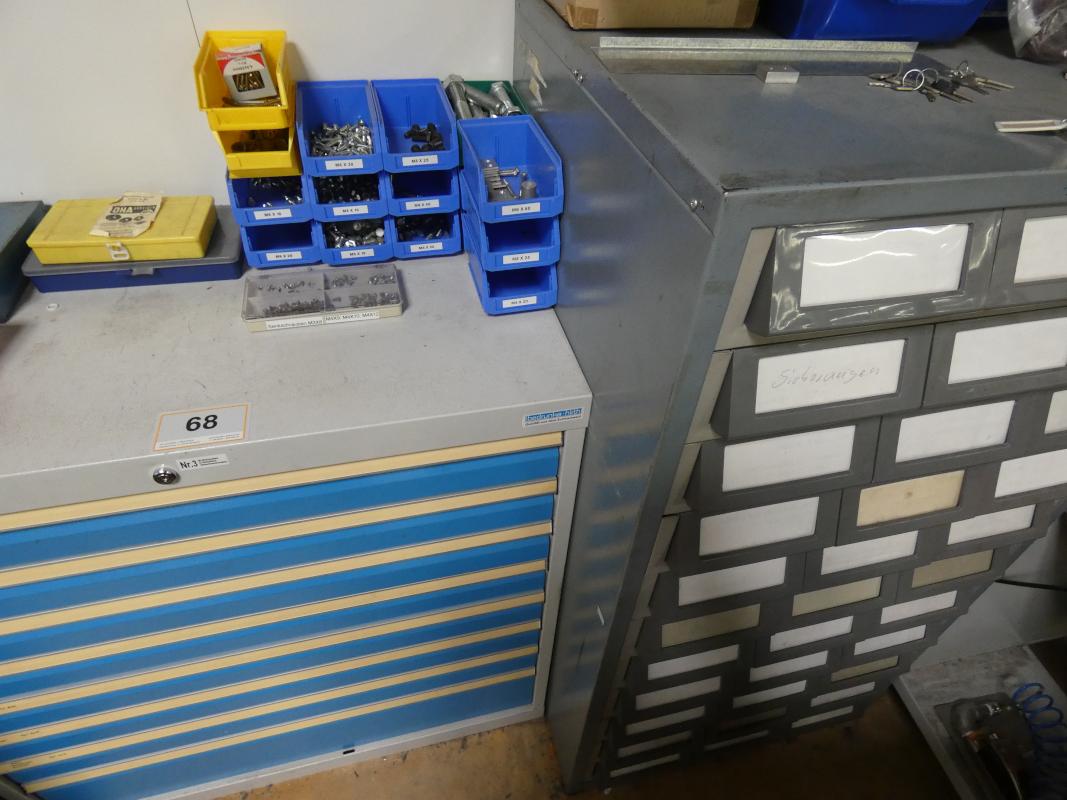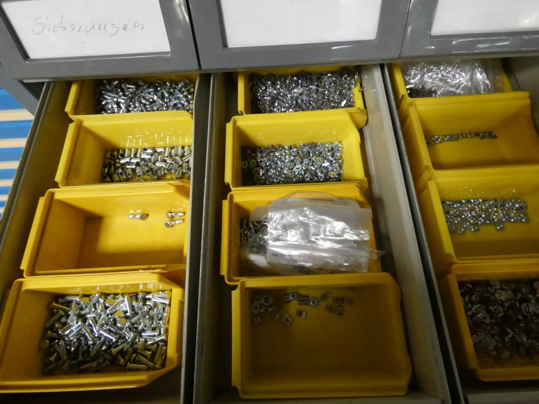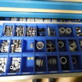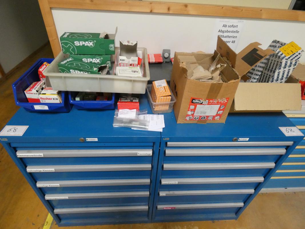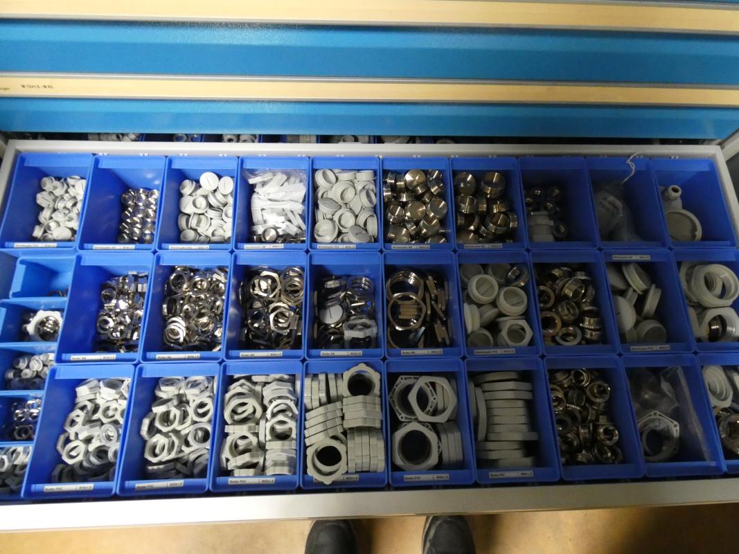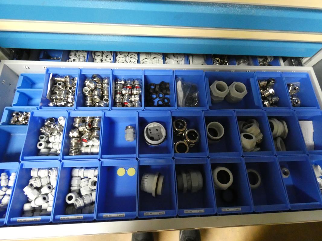 2x Lista W/D/H 720x720x1000mm, 6 drawers each, 1x Bedrunka & Hirt W/D/H 980x500x1020mm 8 drawers, 1x manufacturer Risto W/D/H 730x660x1370mm 11 drawers, contents: Cabinet cable glands, plastic/metal blind plugs BG8-BG28, copper sealing rings, Usit rings, DIN screws, electrical consumables, circuit breakers 10A-16A 1-pole-3-pole, LH fuses, plug joints, spring pliers, machine accessories, head bolts, rollers