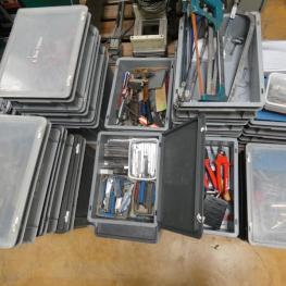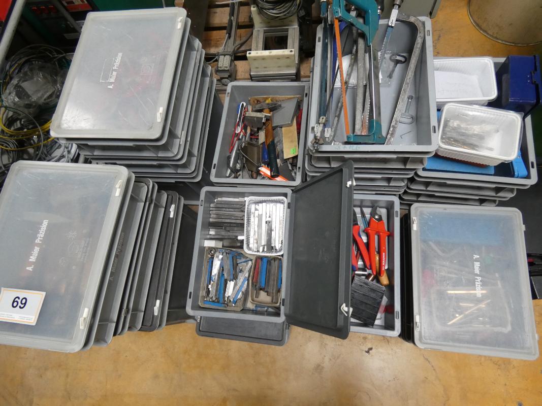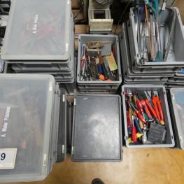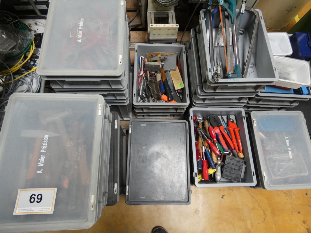 Consisting of: approx. 20 plastic boxes Contents: hammers, pliers, saws, Allen keys, drills