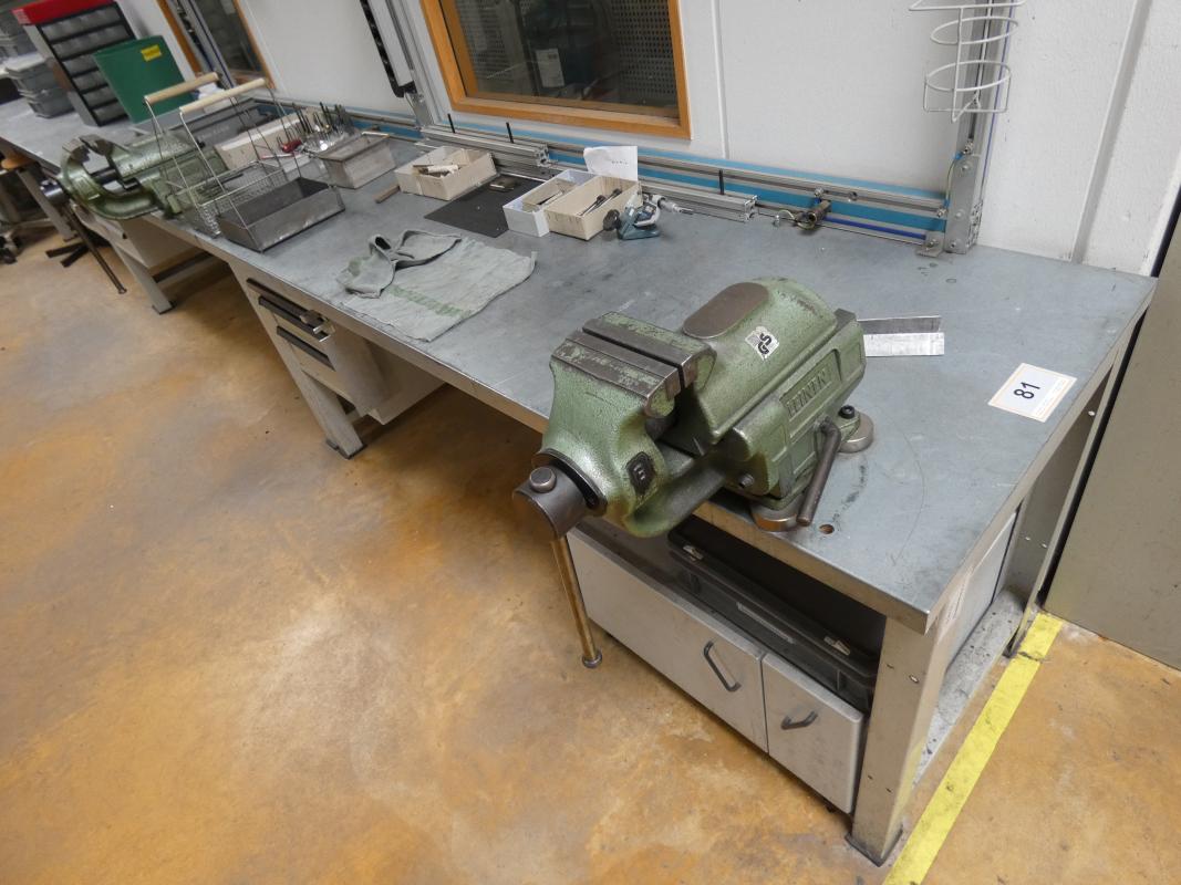 2000 mm each, base unit with 3 pull-out drawers, 2 vices, manufacturer: Leinen, 125 mm, swiveling