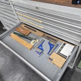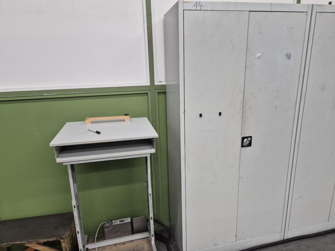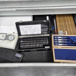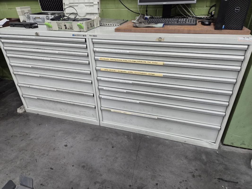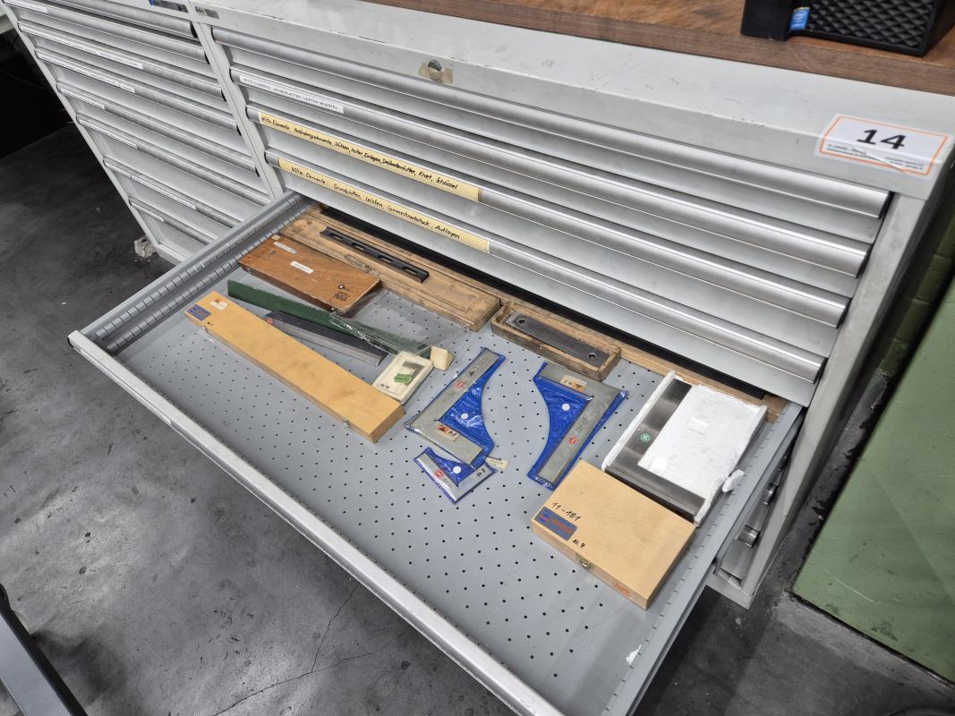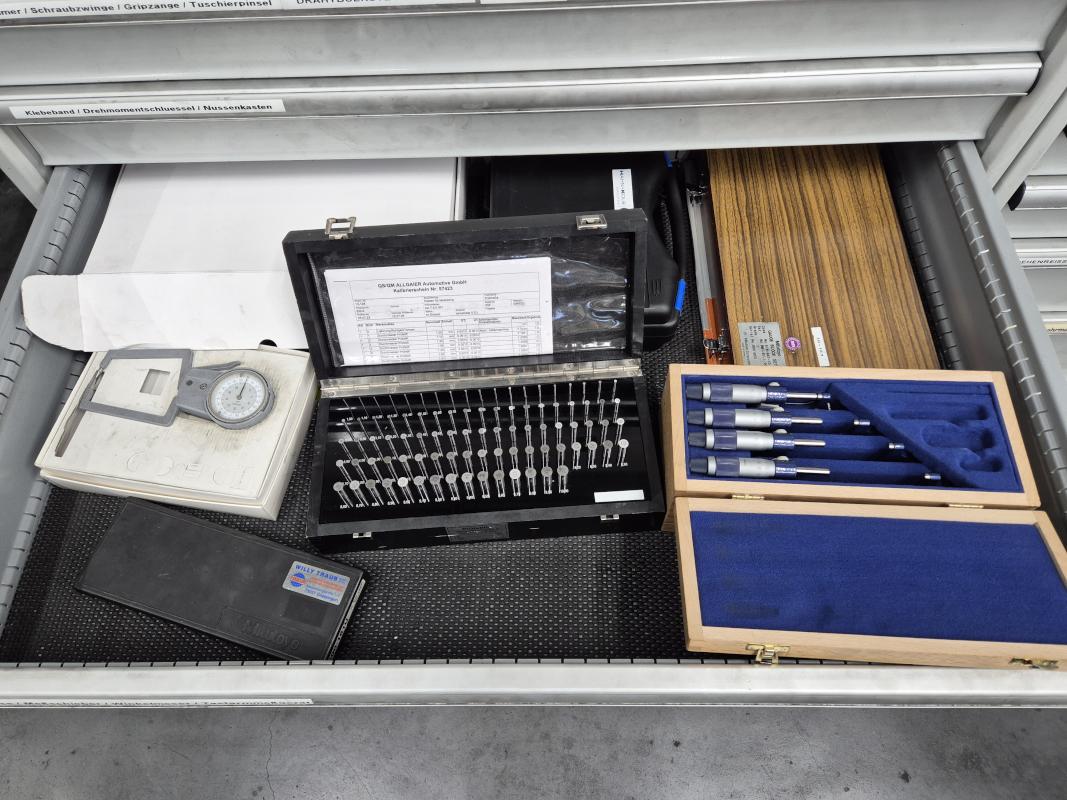 Make: LISTA, Metall, 8 Auszüge, 1 Stahlschrank 2-türig, grau, Inhalt: 3 Drehmomentschlüssel 5-120 Nm, Schnelltaster, Messstifte 1-10 mm, 1 Satz Bügelmessschrauben 0-100 mm, 4-teilig, Endmasskasten 85-teilig (unvollständig), 2 DL Handarbeitszeuge, Magnetmessuhrenhalter, Witte Spannsystem Elemente