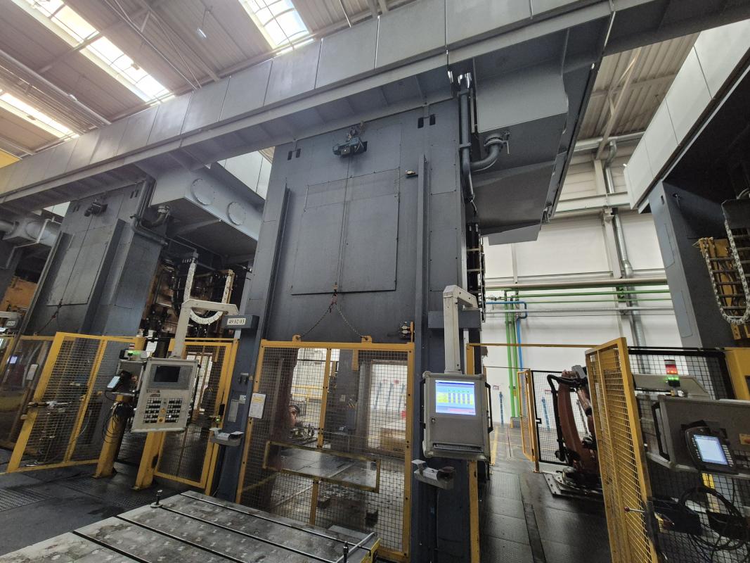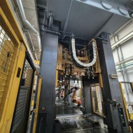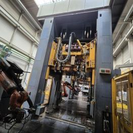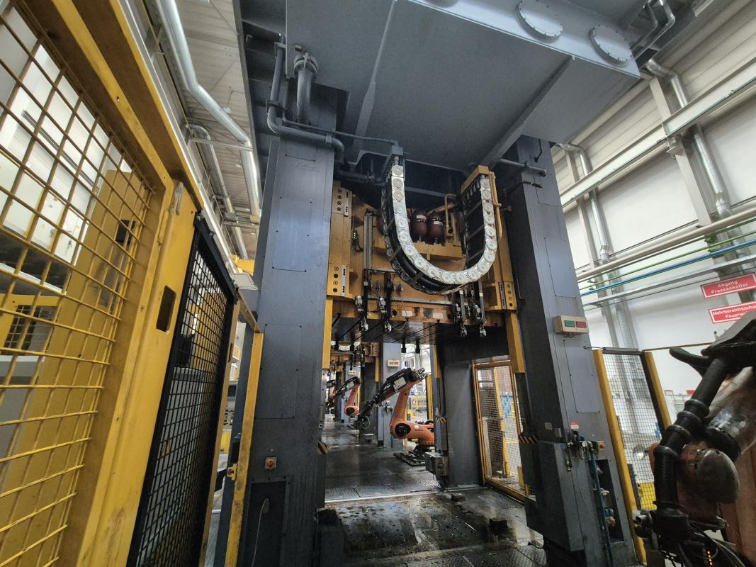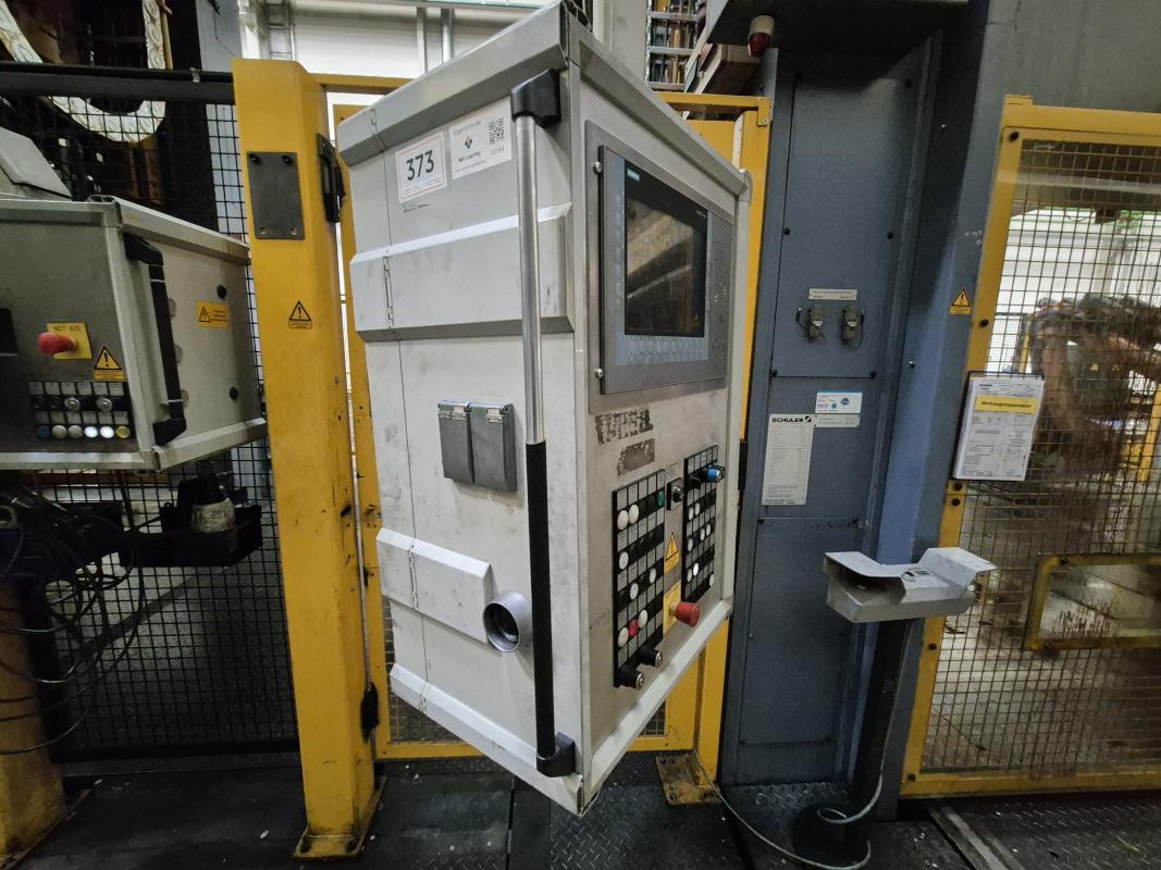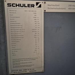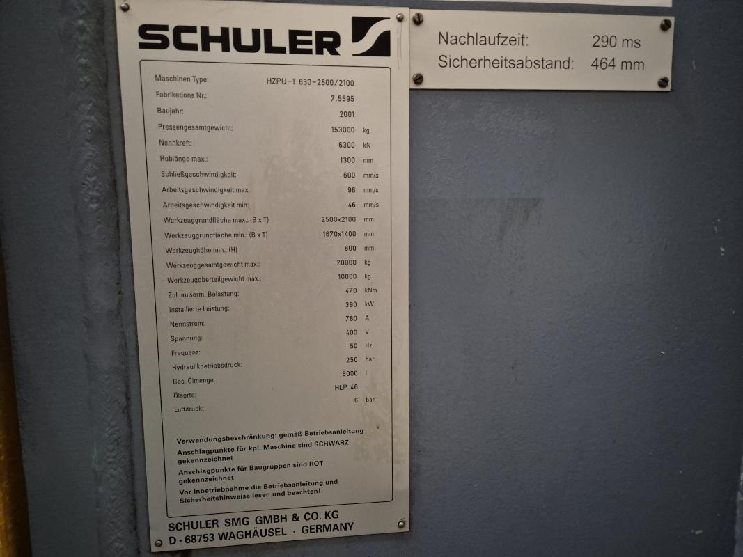 Make: SCHULER SMG, Model: HZPU-T 630-2500/2100, Year of construction: 2001, Serial no. 7.5595, press force 630 t, shuttle table 2,500 x 2,100 mm, ram area 2,500 x 2,100 mm, ram stroke max. 1,300 mm, table draw cushion pressure 24–160 t, draw cushion stroke 200 mm, ram draw cushion pressure 15–100 t, draw cushion stroke 150 mm, press control with OP Siemens Simatic OP 37, switch and control cabinets