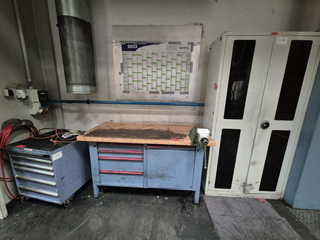 L/B ca. 1.400 x 700 mm, Schraubstock, 1-türig, 4 Auszüge, 1x Rollcontainer, 5 Auszüge, 1x Metallschrank, B/T/H ca. 1.000 x 400 x 1.900 mm, 2-türig
