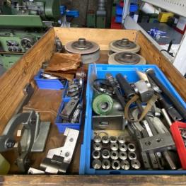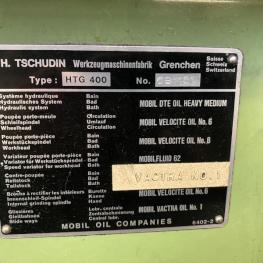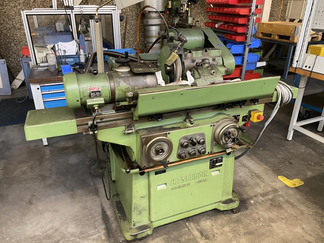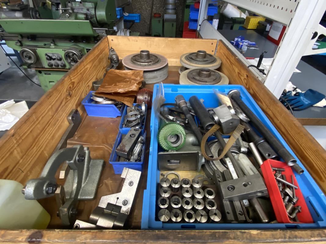 Make: TSCHUDIN, Model: HTG 400, Serial no. 6S1150, grinding length 400 mm, centre height 100 mm, tailstock, coolant device, workbench, 2,000 x 750 mm, perforated sheet metal rear panel, 2 drawer cabinets, W 1,000/700 mm, 6/8 pull-outs, contents: Tips, profile mandrel, grinding mandrels, drivers, collets, setup tools