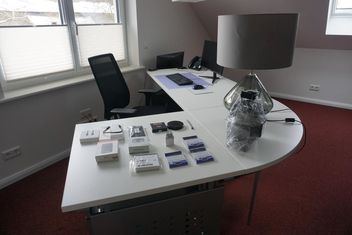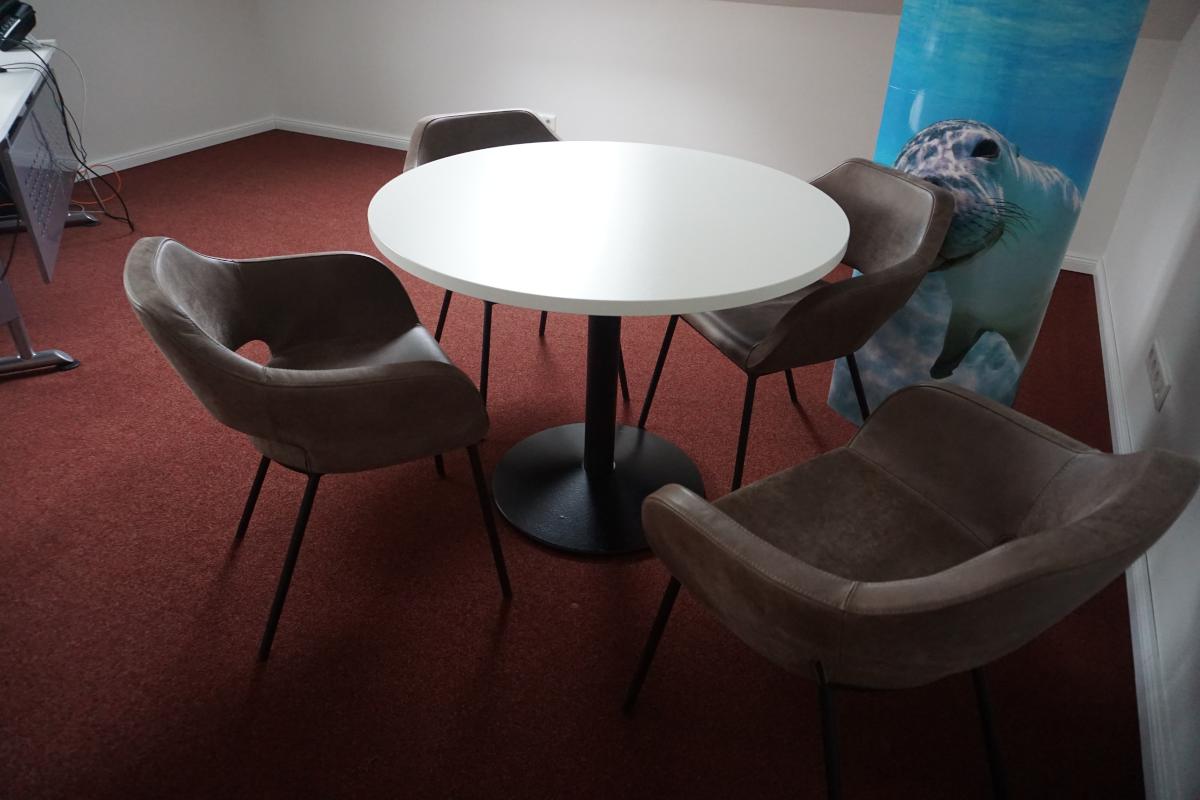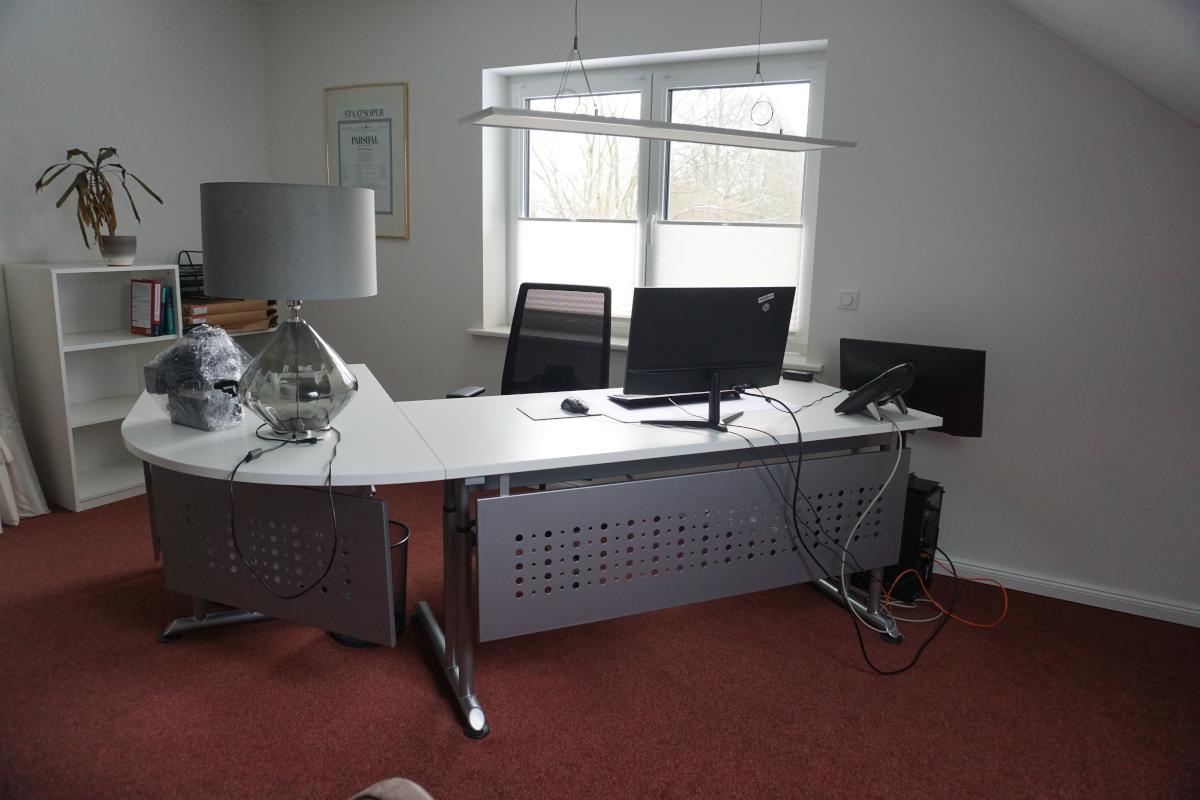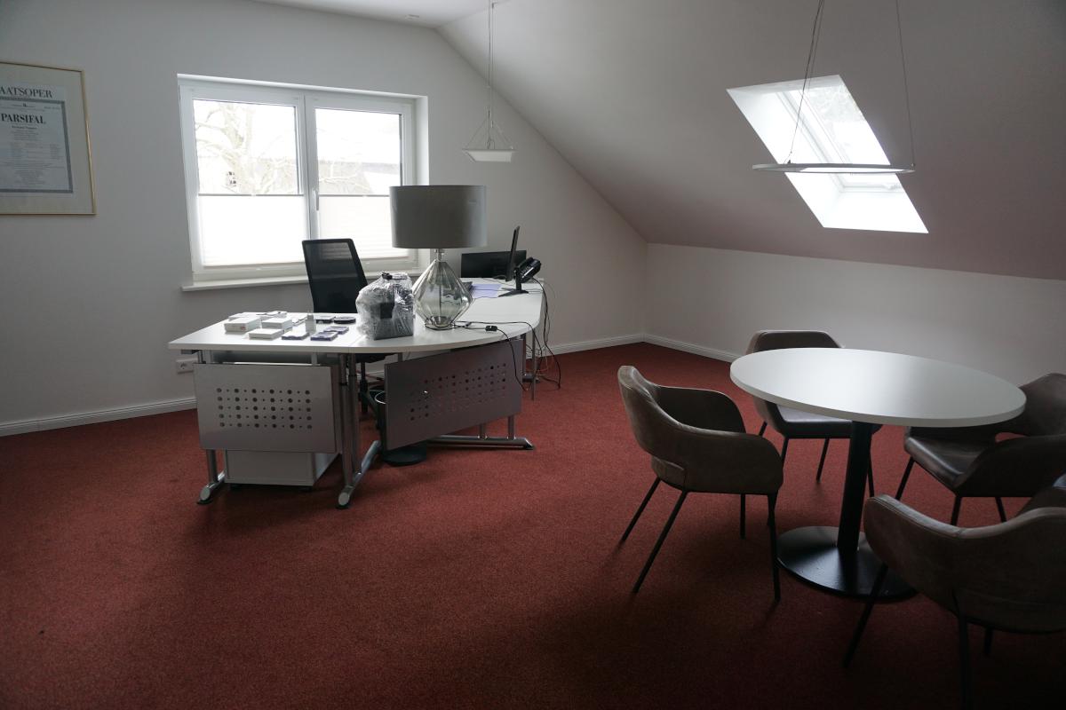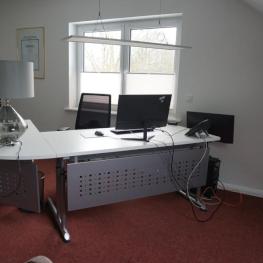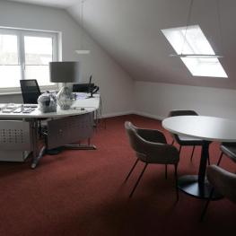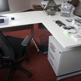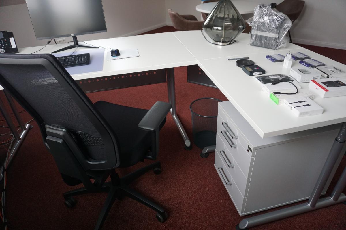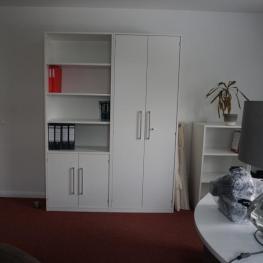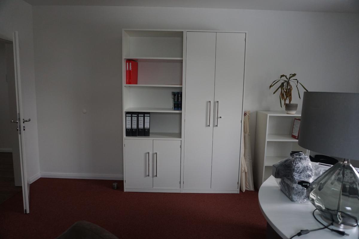 Consisting of: cabinet wall, 1,800 x 2,000 mm, 2-part, of which 1x 2-door and 1x with open shelves and 2-door base cabinet, 2 sideboards with 3/2 shelves, desk, L-shaped, rounded, L approx. 3,000 mm, office chair, mfr. Dauphin, seating set consisting of table, round, white surface, black metal base, 4 x armchairs, brown leather upholstery, black metal bases (sale without IT equipment)