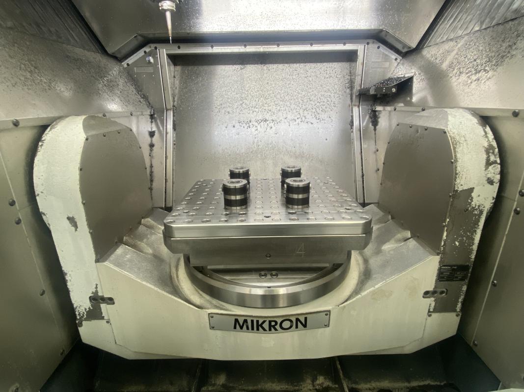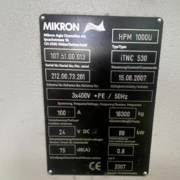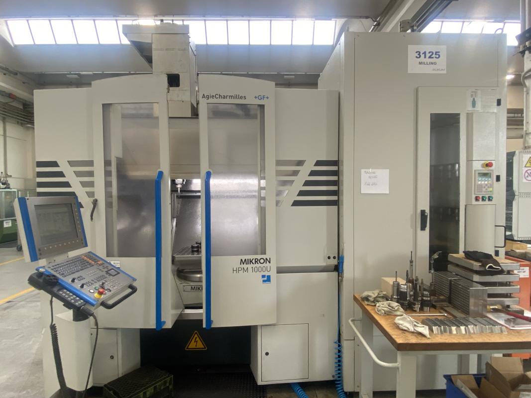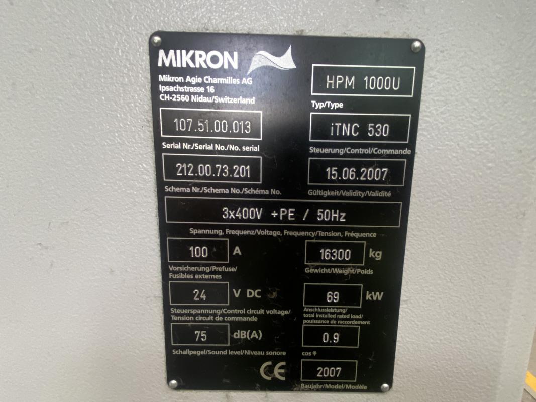 Make: MIKRON, Model: HPM1000U, Year of construction: 2007, Serial no. 107.51.00.013, control, manufacturer Heidenhain, type ITNC530, 5 axes, rotary/swivel table, travel range X/Y/Z 1,000 x 700 x 700 mm, electric spindle, manufacturer STEP TEC, max. speed 24,000 rpm, 5-station pallet changer, pallet size 500 x 600 mm, 165-fold tool changer, tool holder HSK 63, chip conveyor, belt filter, IKZ, coolant temperature control, cabin, BLUM laser measuring system, tool and accessory package, workbench, mobile, 6 pull-outs, 1 door, WTS trolley, orange, 2 table trolleys, contents: tool holders, clamping devices, FCS zero-point clamping system, 5 grid plates, HD vice