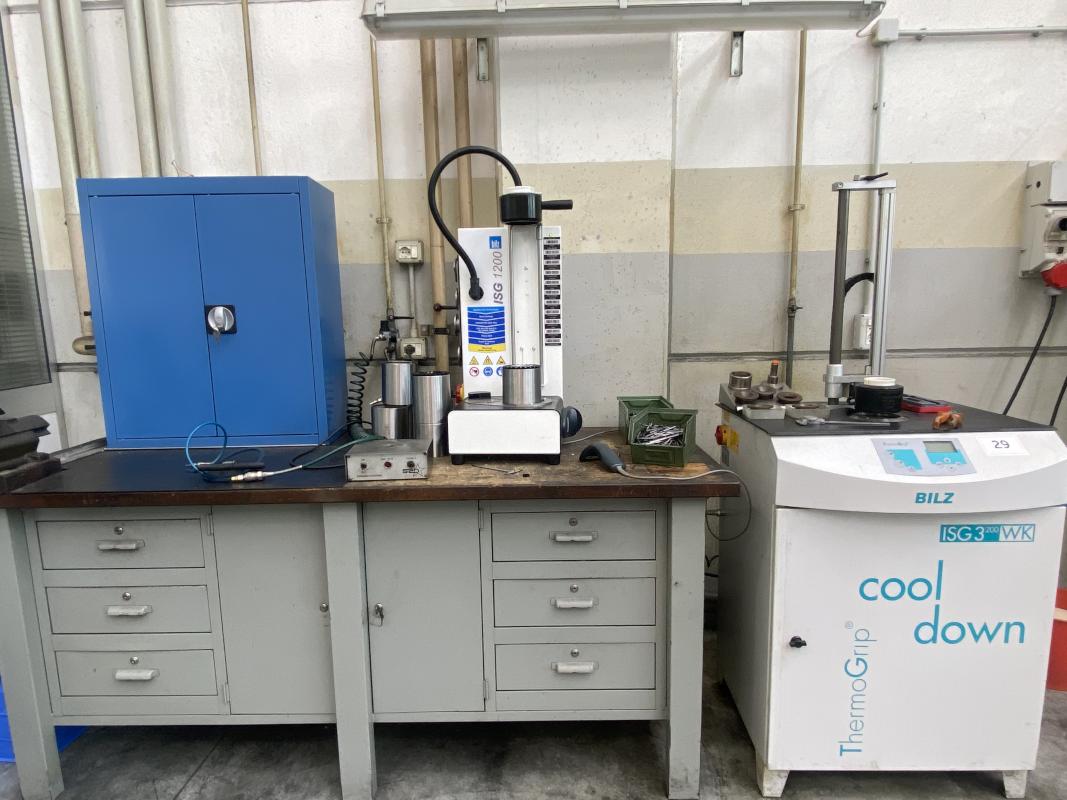 Make: BILZ, Model: ISG3200WK, Workbench, 2,000 x 750 mm, tool shrinking device, manufacturer Bilz, type Thermogrip (table model), 3 telescopic drawer cabinets, 2x 10 drawers, 1x 9 drawers, tool cabinet, blue, 2 doors