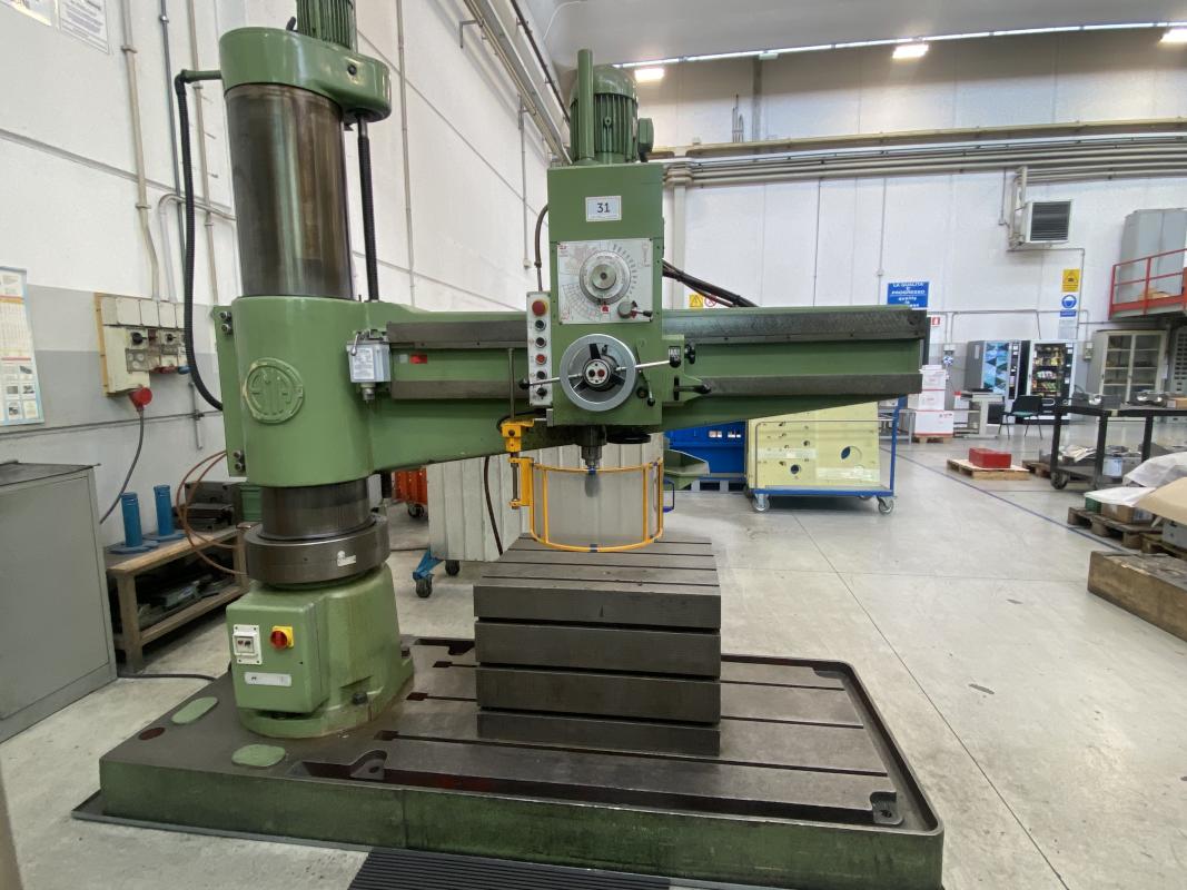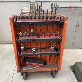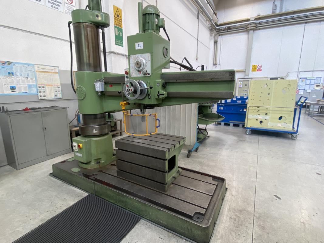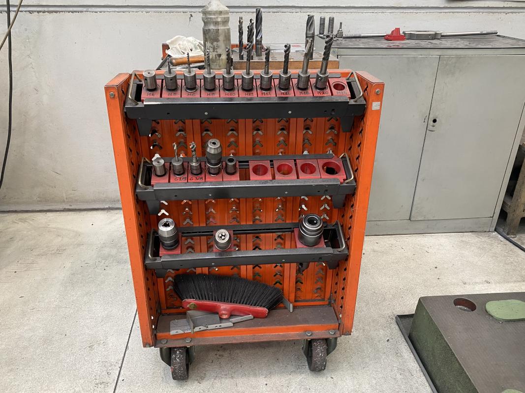 Make: EMA, Serial no. 4523, reach 1,600 mm, max. speed 1,500 rpm, max. feed 0.55 mm/rev, clamping cube 610 x 770 x 510 mm, WTS trolley, tool cabinet, 2 doors, contents: spiral drill, drill vise, setup tools, drill chuck, thread cutting chuck