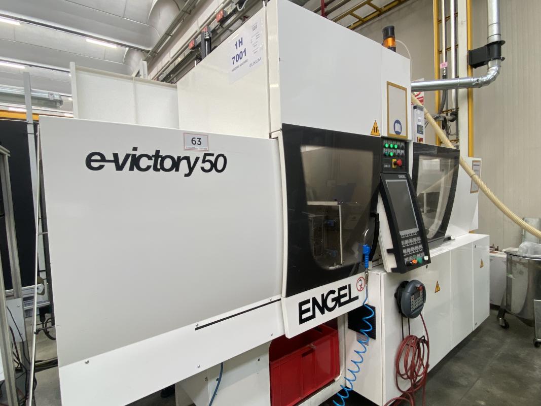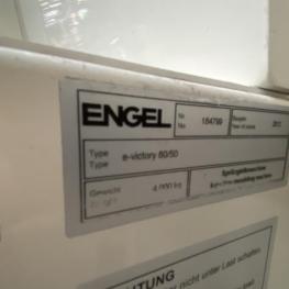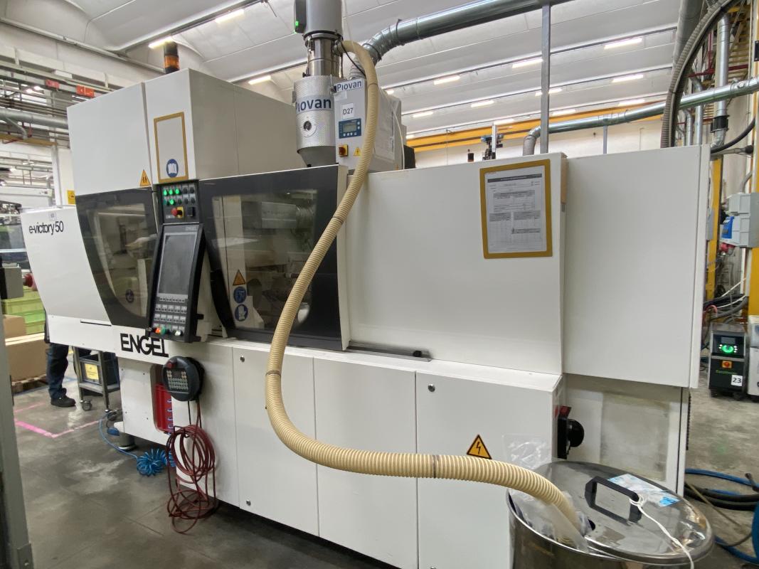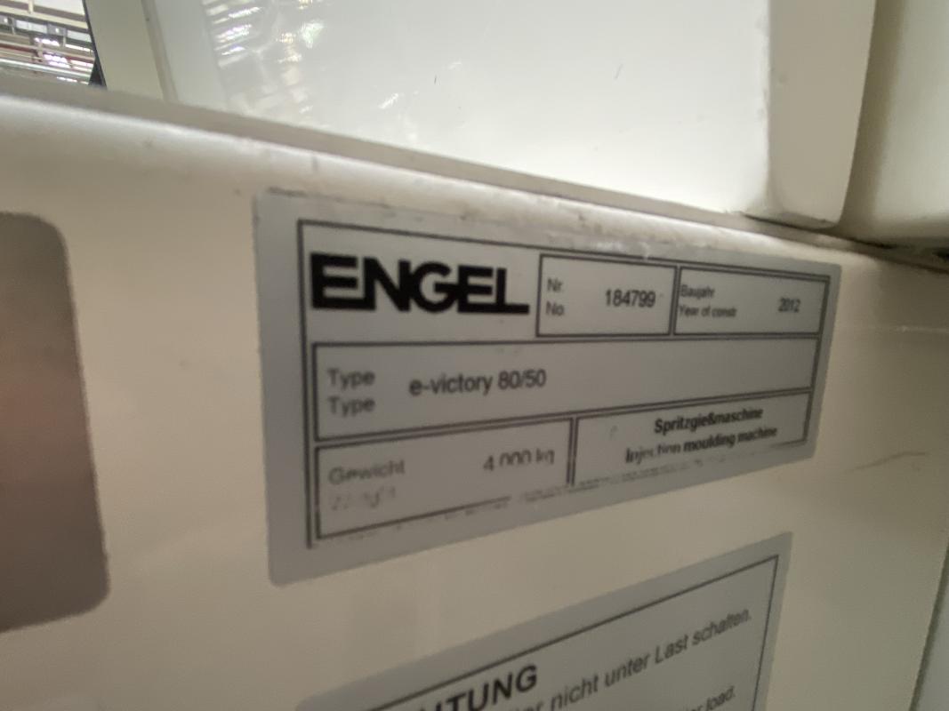 Make: ENGEL, Model: E-Victory 80/50, Year of construction: 2012, Serial no. 184799, control system, manufacturer Engel, type CC200, clamping force 50 t, column spacing 500 x 500 mm, screw diameter 18 mm, shot weight max. 34 g, removal robot, manufacturer Engel, type Viper 12, programming terminal, belt conveyor, made by Engel, L 2,500 mm, attachment dryer, Piovan DPA 10C, conveyor device Piovan