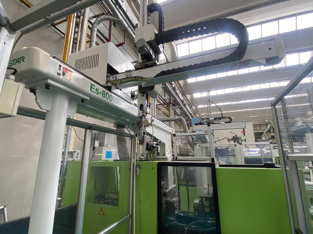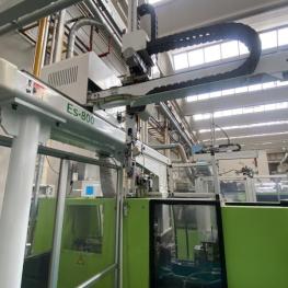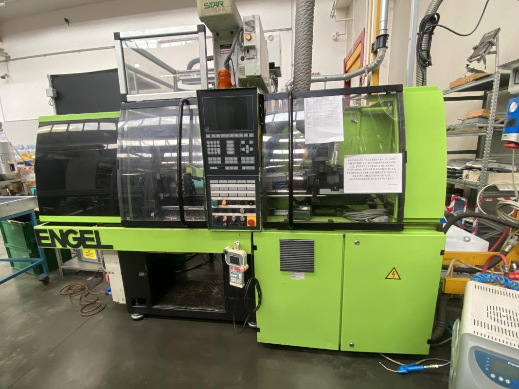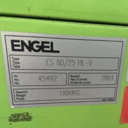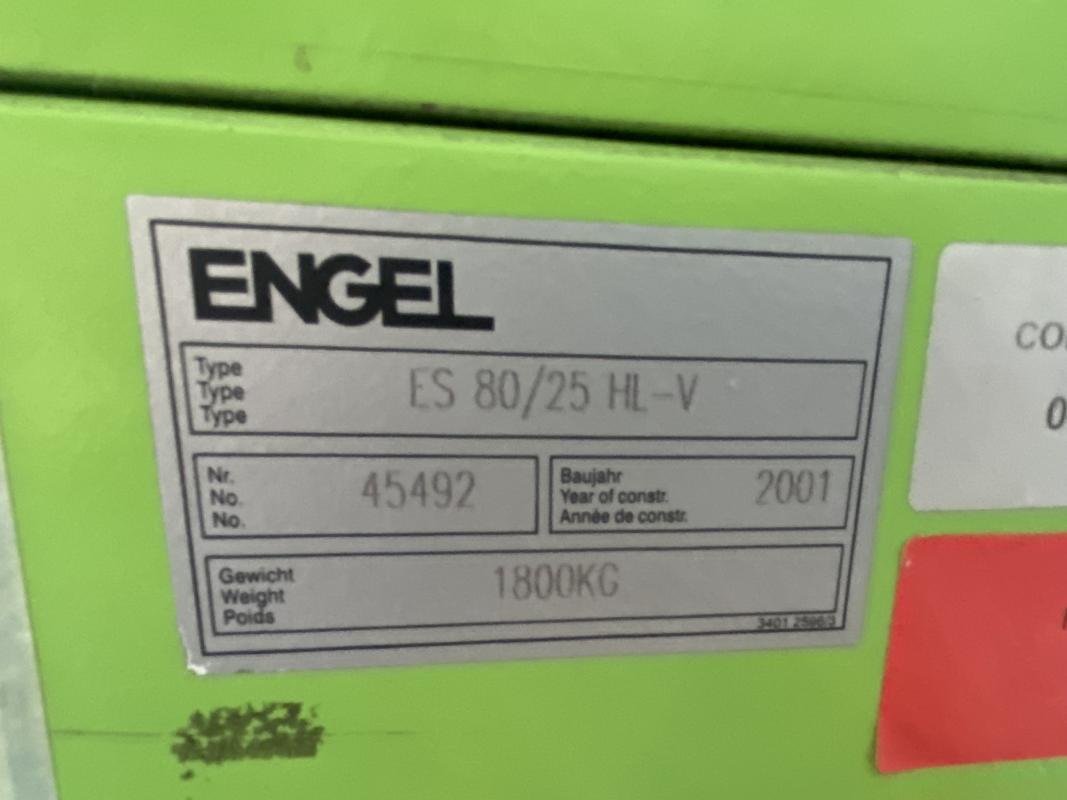 Make: ENGEL, Model: ES80/25HL-V, Year of construction: 2001, serial no. 45492, control system, manufacturer Engel, type CC100, clamping force 25t, tie-barless, screw Ø 18 mm, shot weight max. 22 g, removal robot, manufacturer Star, type ES-800, year of manufacture 2012, serial no. 02502, belt conveyor, manufacturer MB