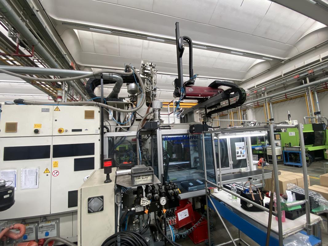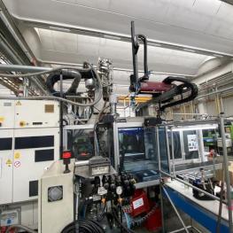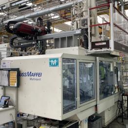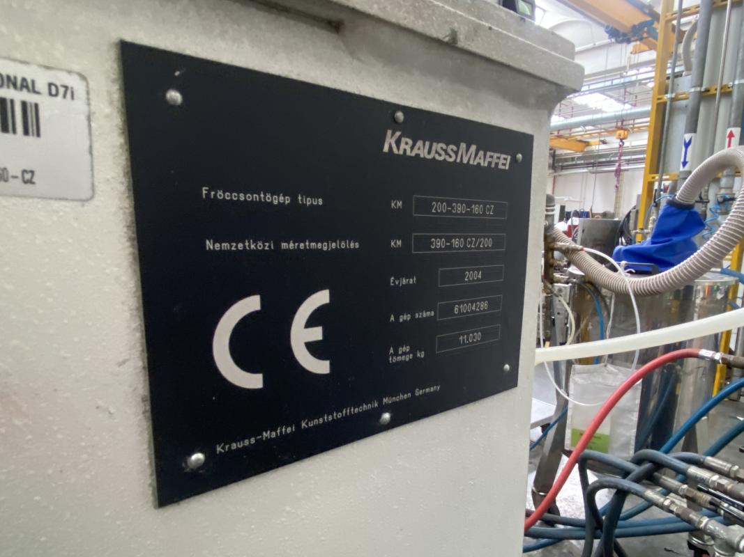Make: KRAUSS MAFFEI, Model: KM200-390-160CZ, Year of construction: 2007, serial no. 61004286, control system, manufacturer Krauss Maffei, type MC4, 2 injection units, rotary table, clamping force 200 t, column spacing 630 x 560 mm, screw diameter 25/18 mm, shot weight max. 47/20.8 g, removal robot, manufacturer Krauss Maffei, manual control terminal Weintek, 2 conveyors, manufacturer Piovan