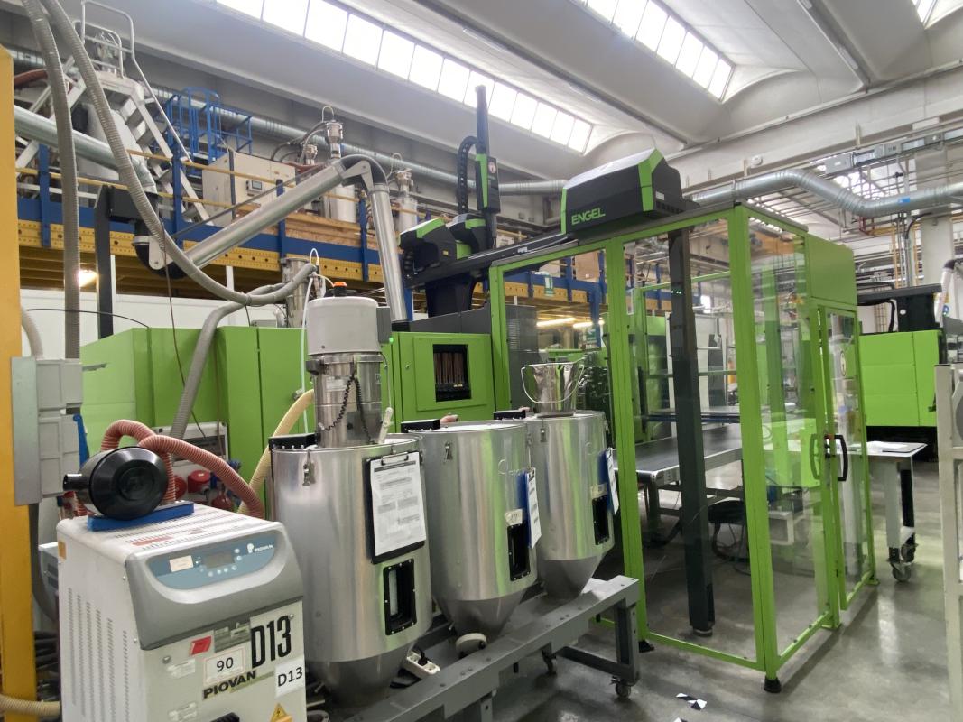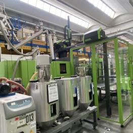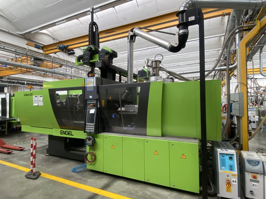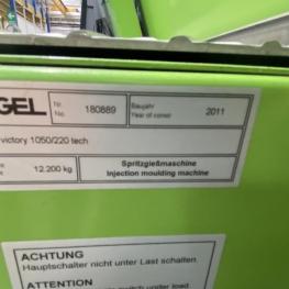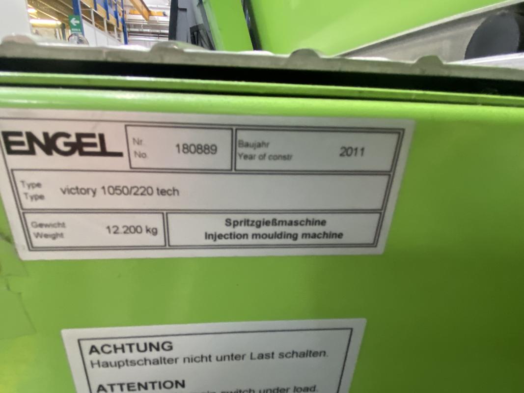 Make: ENGEL, Model: Victory 1050/220Tec, Year of construction: 2011, serial no. 180889, control system, manufacturer Engel, type CC200, clamping force 220t, tie-bar-less, screw Ø 55 mm, shot weight max. 449 g, conveyor, manufacturer Piovan, removal robot, made by Engel, type Viper 20, belt conveyor, made by Engel, 5,000 x 900 mm