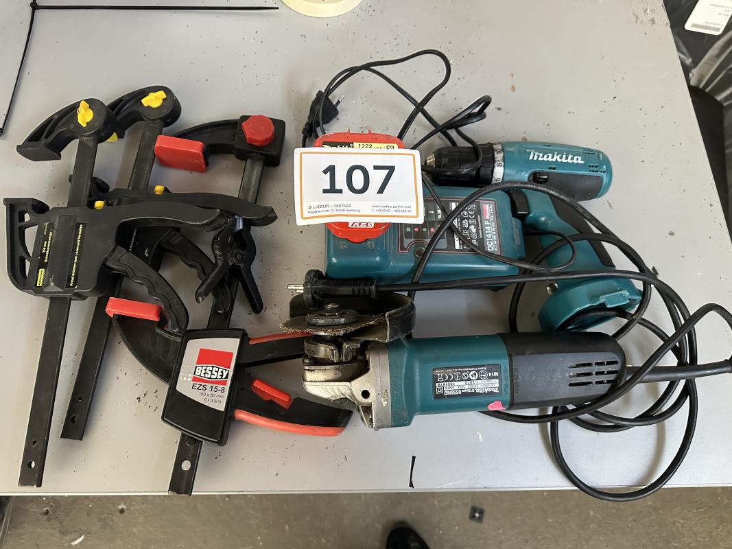 such as cordless screwdriver, battery, charger, one-hand angle grinder, 3 collets