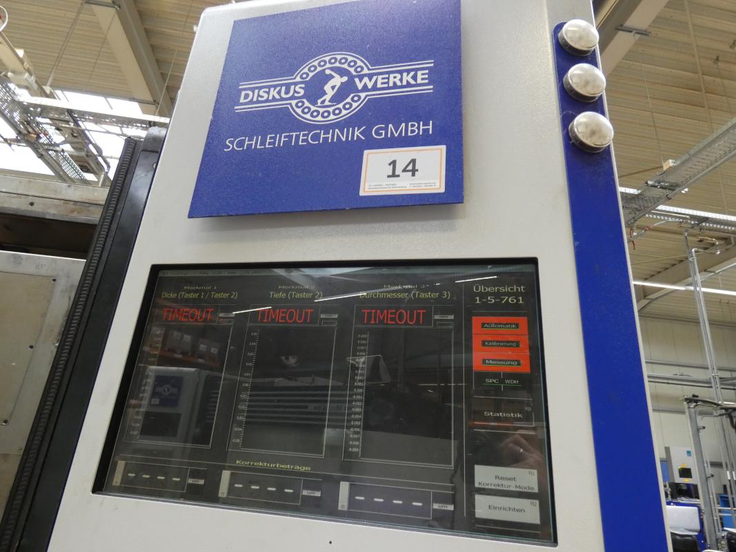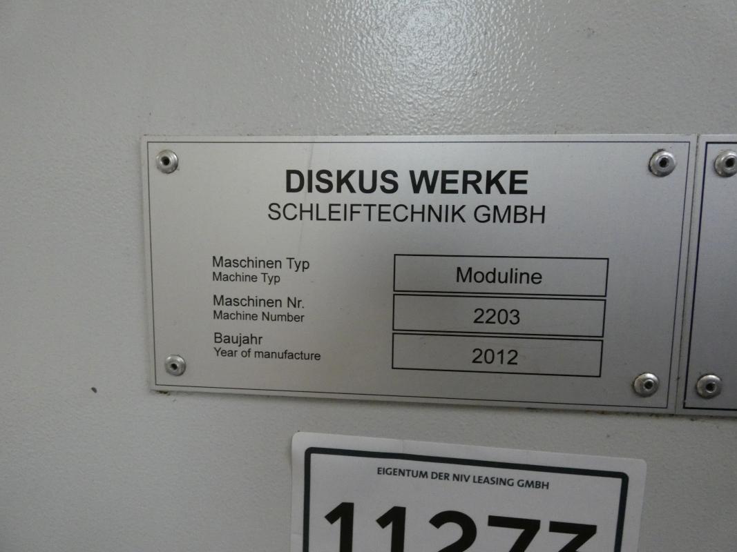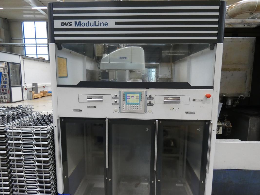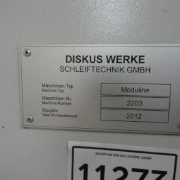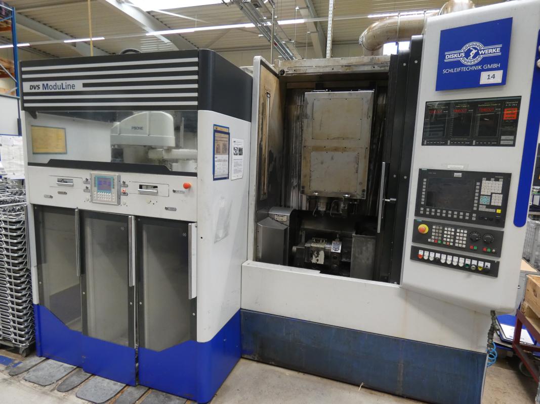 Make: DISKUS-WERKE, Model: ModuLine DS 300 SO, Year of construction: 2012, Machine No. 2203, Siemens Sinumerik 840D sl control system, 2 spindles, spindle spacing 210 mm, maximum workpiece diameter 80 mm, maximum workpiece height 40 mm, maximum spindle speed approx. 4000 rpm, grinding spindle 2000 rpm, 8-position tool turret Sauter, type 0.5.480.516, tool holder Capto C5, workpiece automation device DVS Moduline, transfer robot Epson, Siemens PLC, Simatic Panel Touch display, coolant system Knoll, type KF150/950, paper belt filter, chip conveyor Knoll, type 225S-2/170