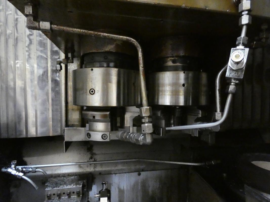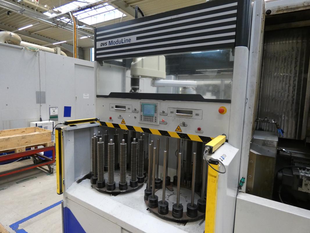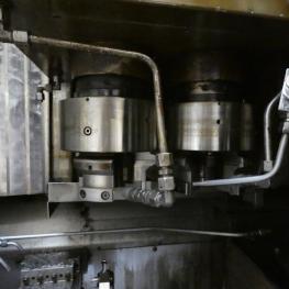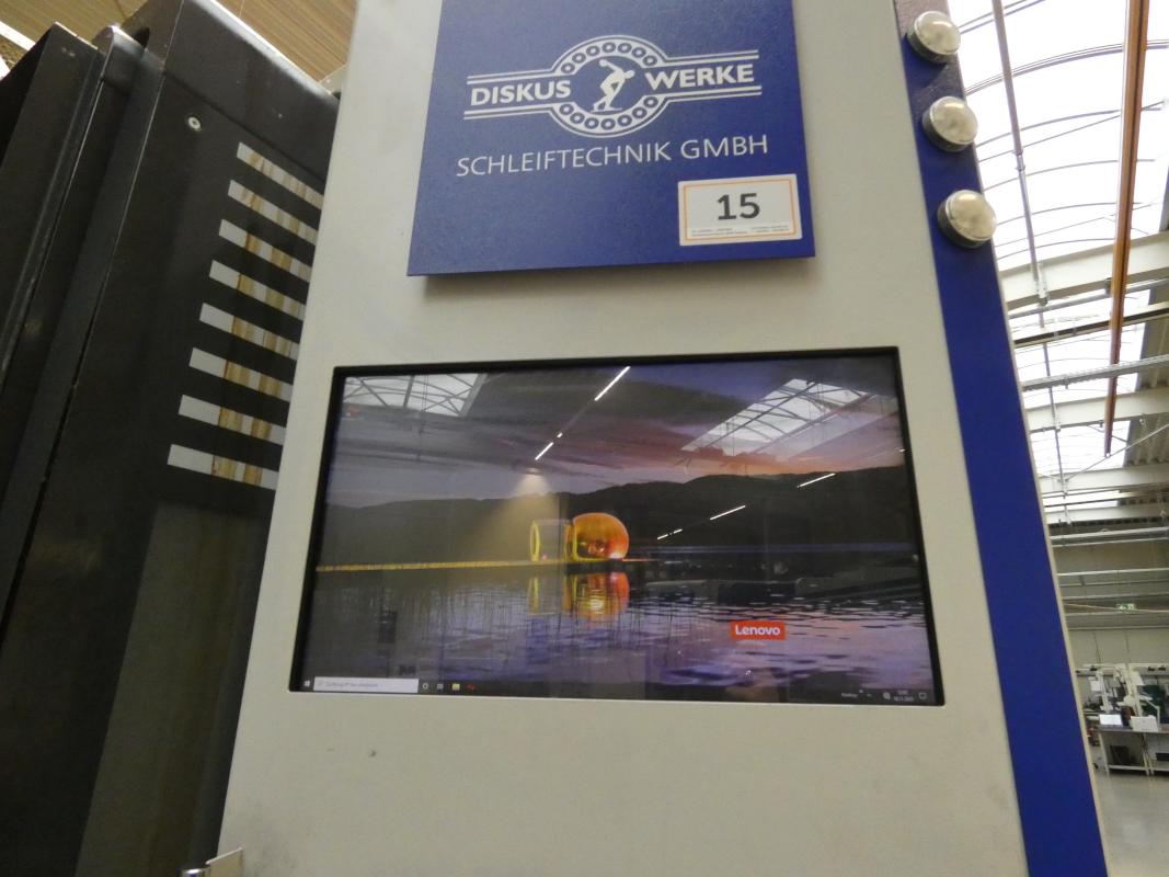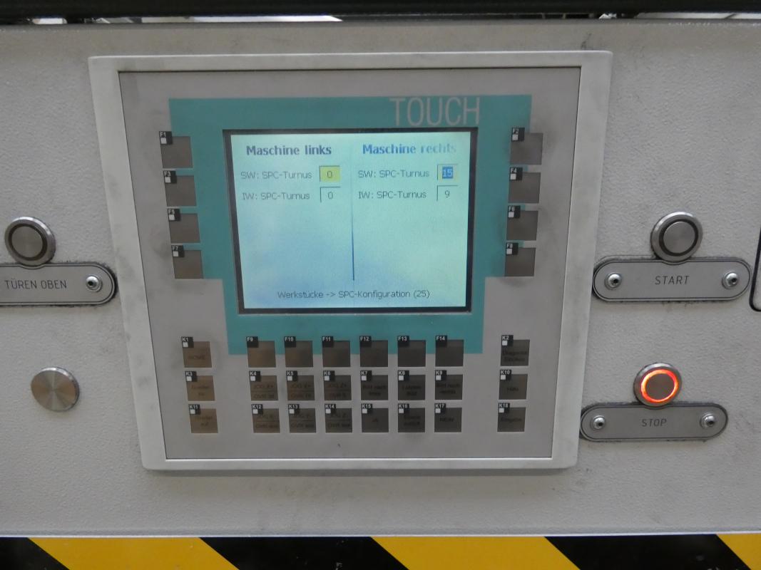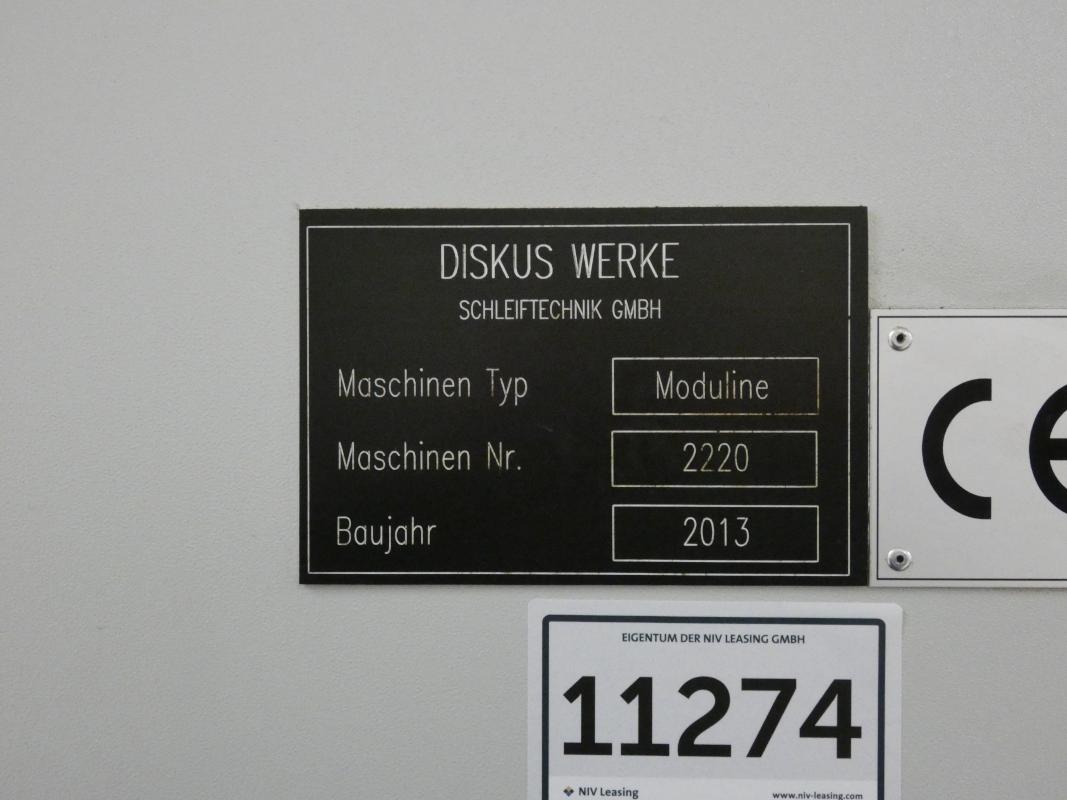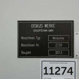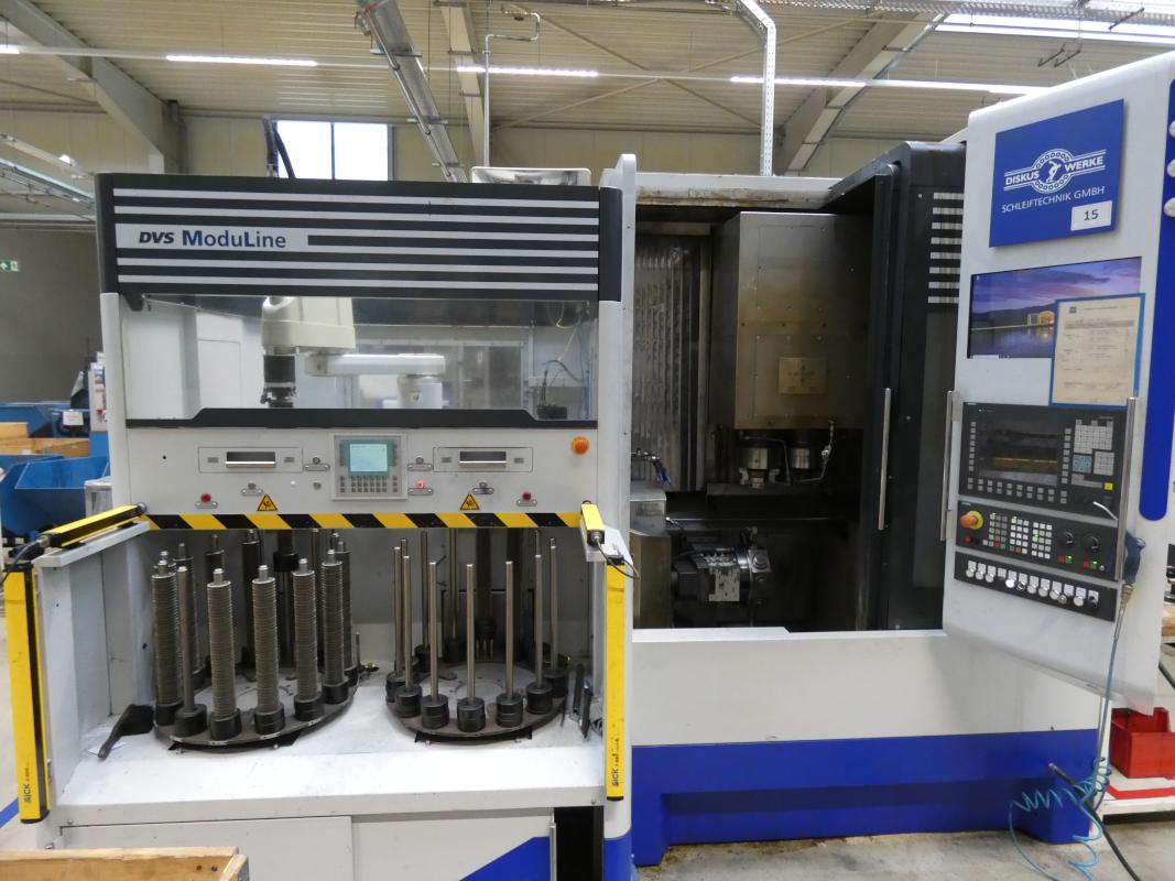 Make: DISKUS-WERKE, Model: ModuLine DS 300 SO, Year of construction: 2013, Ma.-No. 2220, Siemens Sinumerik 840D sl control system, 2 spindles, spindle spacing 210 mm, maximum workpiece diameter 100 mm, maximum workpiece height 40 mm, maximum spindle speed approx. 4000 rpm, grinding spindle 2000 rpm, 8-position tool turret Sauter, type 0.5.480.516, tool holder Capto C5, workpiece automation device DVS Moduline, transfer robot Epson, Siemens PLC, Simatic Panel Touch display, coolant system Knoll KF150/950, paper belt filter, chip conveyor Knoll 225S-2/170