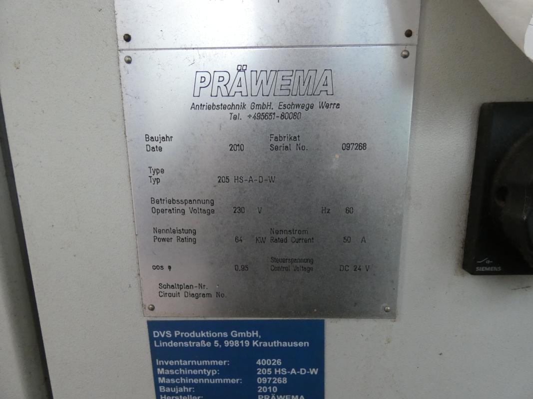 Make: PRÄWEMA, Model: 205HS-A-D-W Synchrofine, Year of construction: 2010, Machine No. 097268, Control Manufacturer: Rexroth, Type: IndraControl V, incl. hand-held operating terminal, Workpiece Ø 95 mm, Maximum workpiece length: 59 mm, Maximum spindle speed: C-workpiece: 6,000 rpm / 7,000 rpm, B-tool: 2,000 rpm, Maximum feed rates Z/X: 60 m/min, Honing head ZNG No. 41.610.1804-0, Year of manufacture: 2010, Serial No. 275, Granite machine bed, manufactured by Eckbert Reitz, type HFSI204HS, year of manufacture 2009, workpiece automation, surface finish testing device, oil tank, pump, manufactured by Brinkmann, type TA160/350-001, cooling unit, manufactured by Hydac, type BL040-79, serial no. 110919017, operating hours 18.11.25 55,195