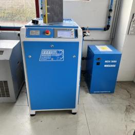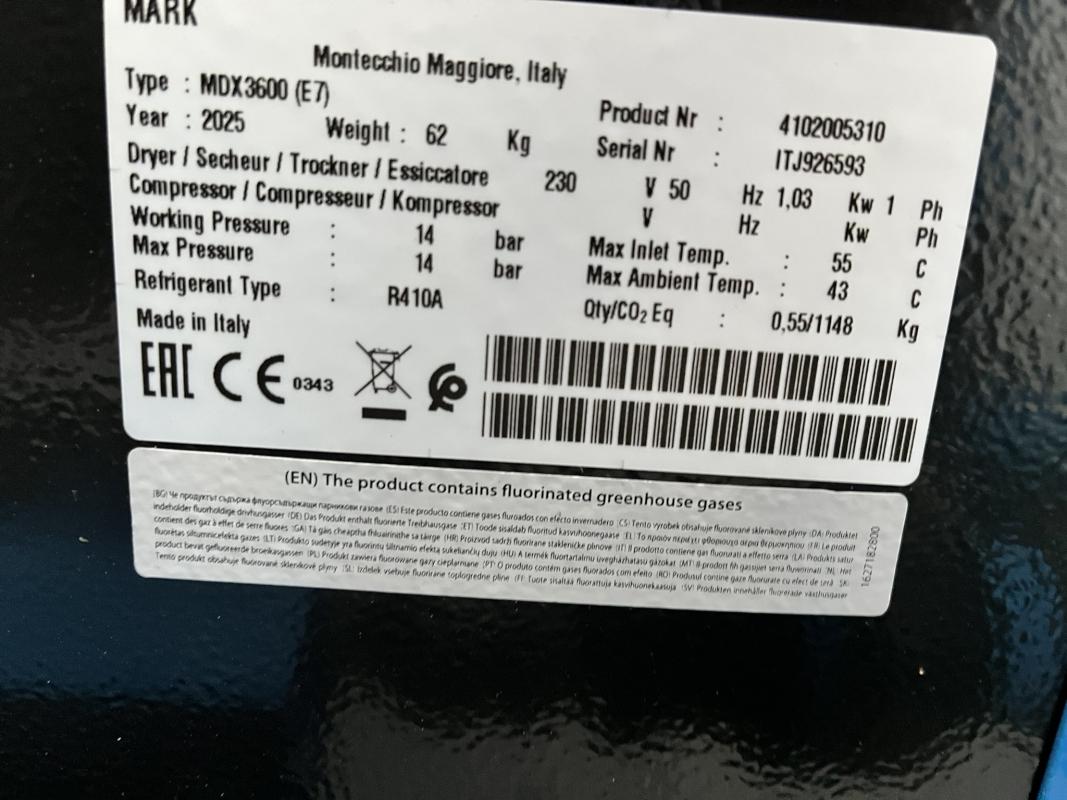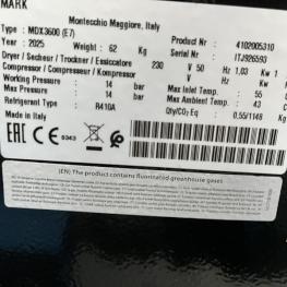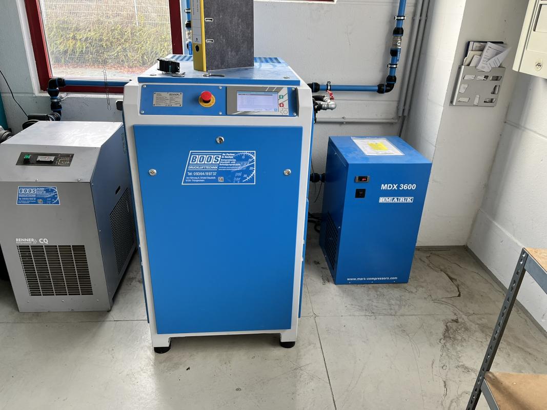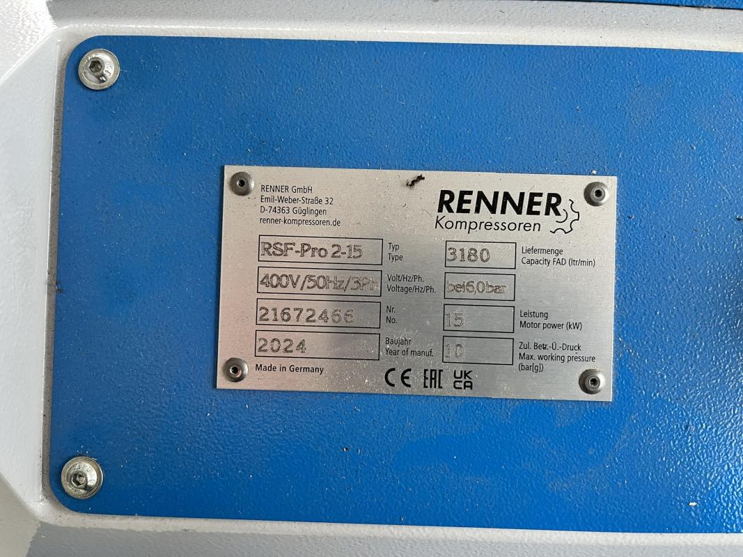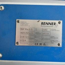 Make: RENNER, Model: RSF-Pro 2-15, Year of construction: 2024, Serial no.: 21672466, Ser. no. 21672466, power 15 kW, permissible operating overpressure 10 bar, volume flow 3,180 l/min, control system, touch control panel, (next service in 922 hours), operating hours: load 3,058, run 3,622, average utilization 84.43%, refrigerated dryer, mfr. Mark, type MDX 3600, YOM 2025, ser. no. ITJ926593
