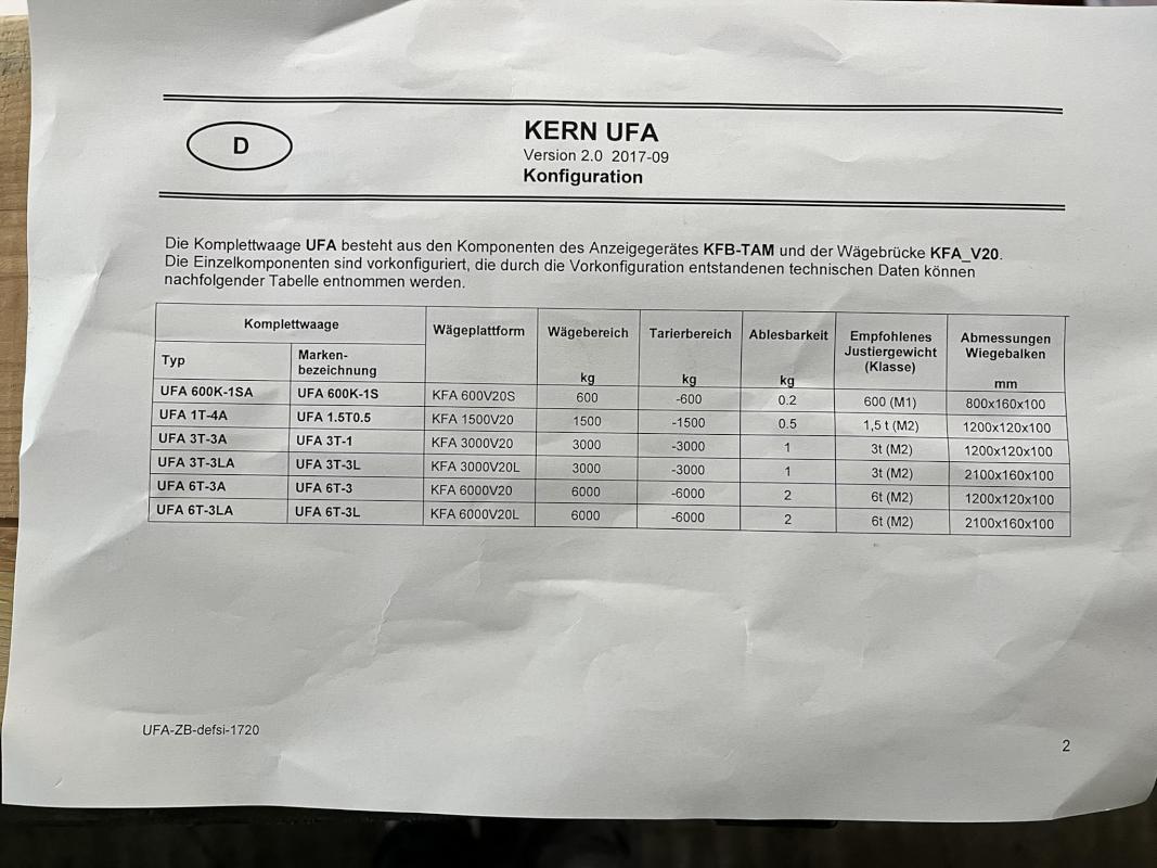 Make: KERN, Model: UFA 3T-3A, Ser.-Nr. WF17036272, Digitalanzeige, Typ KFB-TM, Wägebrücke KFA 3000V20, Wiegebereich max. 3.000 kg, Abm. Wiegebalken 1.200 x 120 x 100 mm